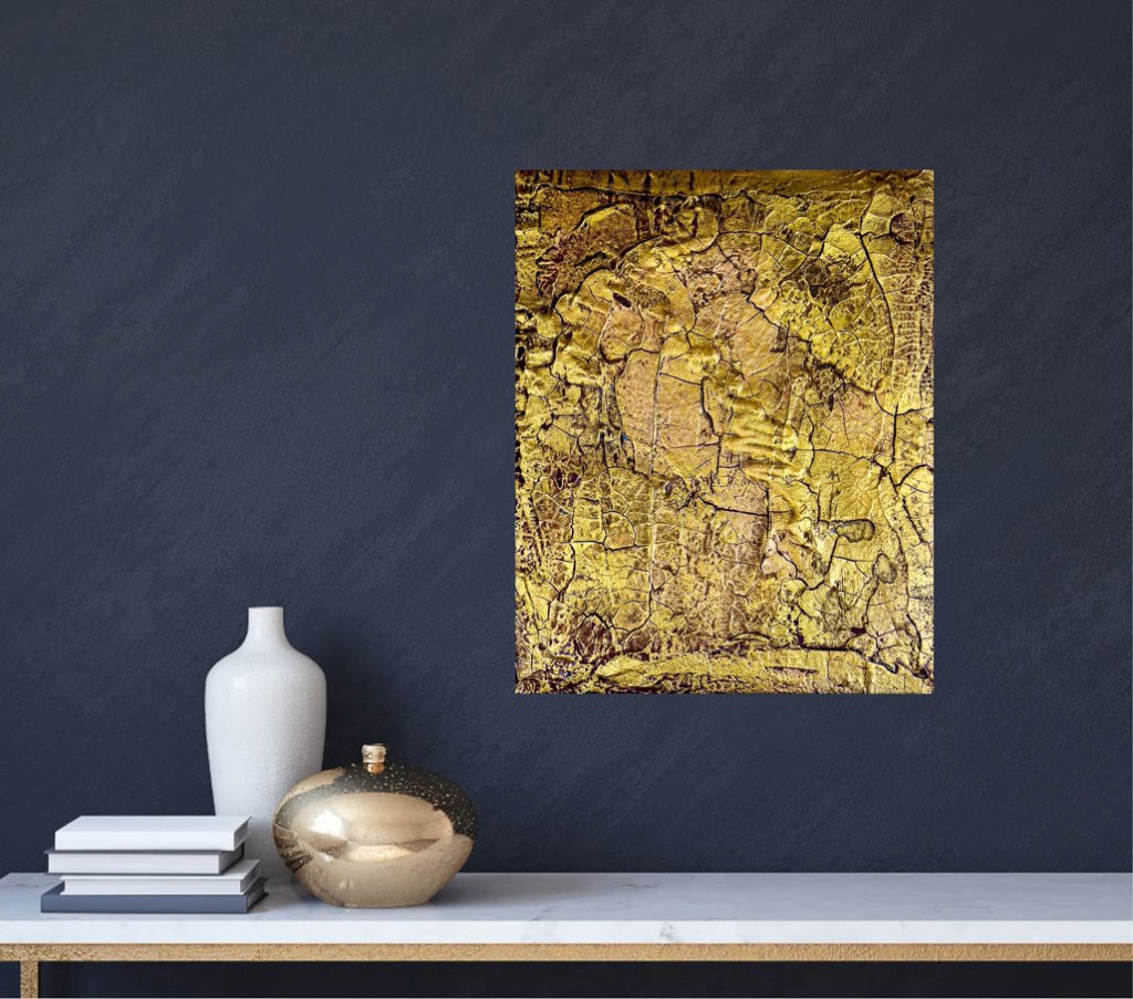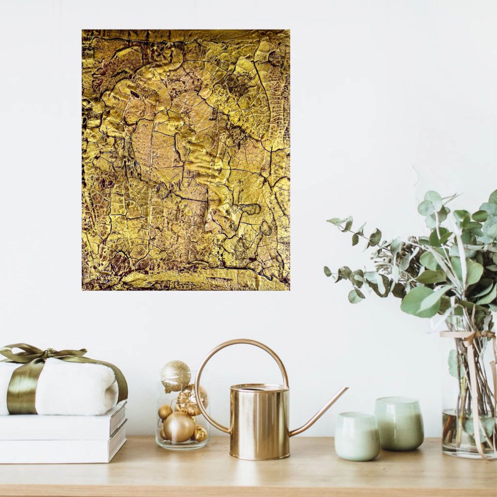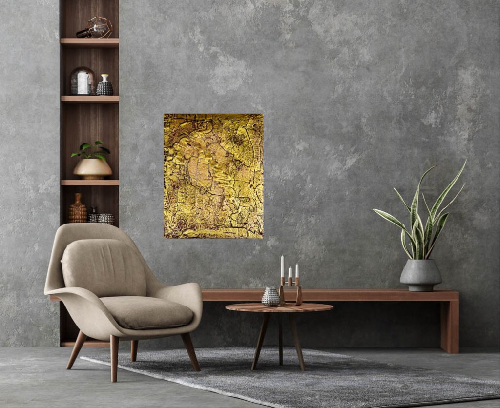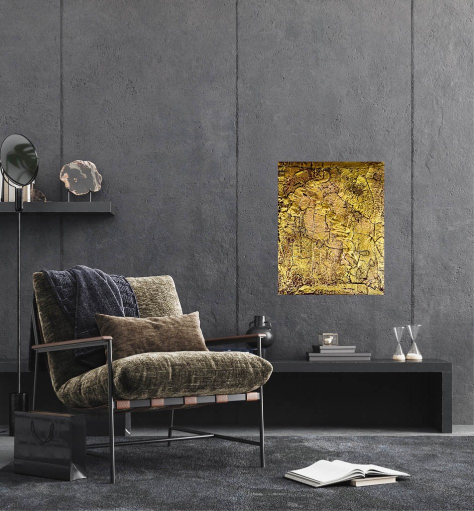 A tribute to the fleeting moments of happiness and confidence. The picture „Golden Times„, painted entirely in shades of gold, captures the essence of warmth and security that illuminates the soul in times of darkness. The three-dimensional design with its highs and lows symbolizes the journey of life that takes us through various phases. But do we really recognize and appreciate these golden times when we experience them? These times are more than just phases of happiness; they are a source of strength that carries us through dark hours, as long as we remember the happiness that is currently obscured by dark clouds. „Golden Times“ is not only a work of art, but also a philosophy of life that teaches us to appreciate the beauty of every moment and to realize that after every darkness in life comes a golden sunshine.
