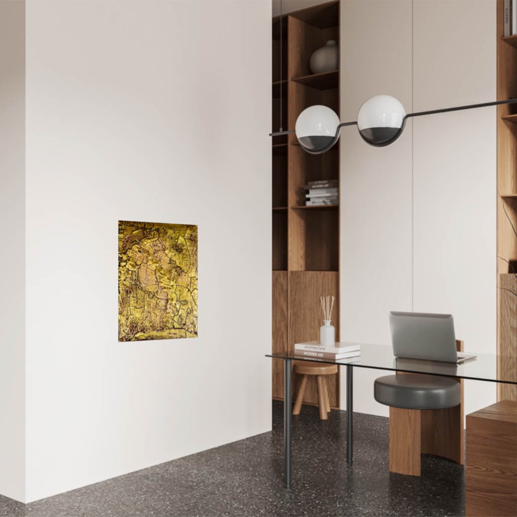 Un homenaje a los momentos fugaces de felicidad y confianza. El cuadro „Tiempos dorados„, pintado íntegramente en tonos dorados, capta la esencia de calidez y seguridad que ilumina el alma en tiempos de oscuridad. El diseño tridimensional con sus altibajos simboliza el viaje de la vida que nos lleva a través de diversas fases. Pero, ¿realmente reconocemos y apreciamos estos tiempos dorados cuando los experimentamos? Estos tiempos son algo más que fases de felicidad; son una fuente de fuerza que nos lleva a través de las horas oscuras, siempre y cuando recordemos la felicidad que actualmente está oscurecida por las nubes negras. „Tiempos dorados“ no es sólo una obra de arte, sino también una filosofía de vida que nos enseña a apreciar la belleza de cada momento y a darnos cuenta de que después de cada oscuridad en la vida viene un sol dorado.