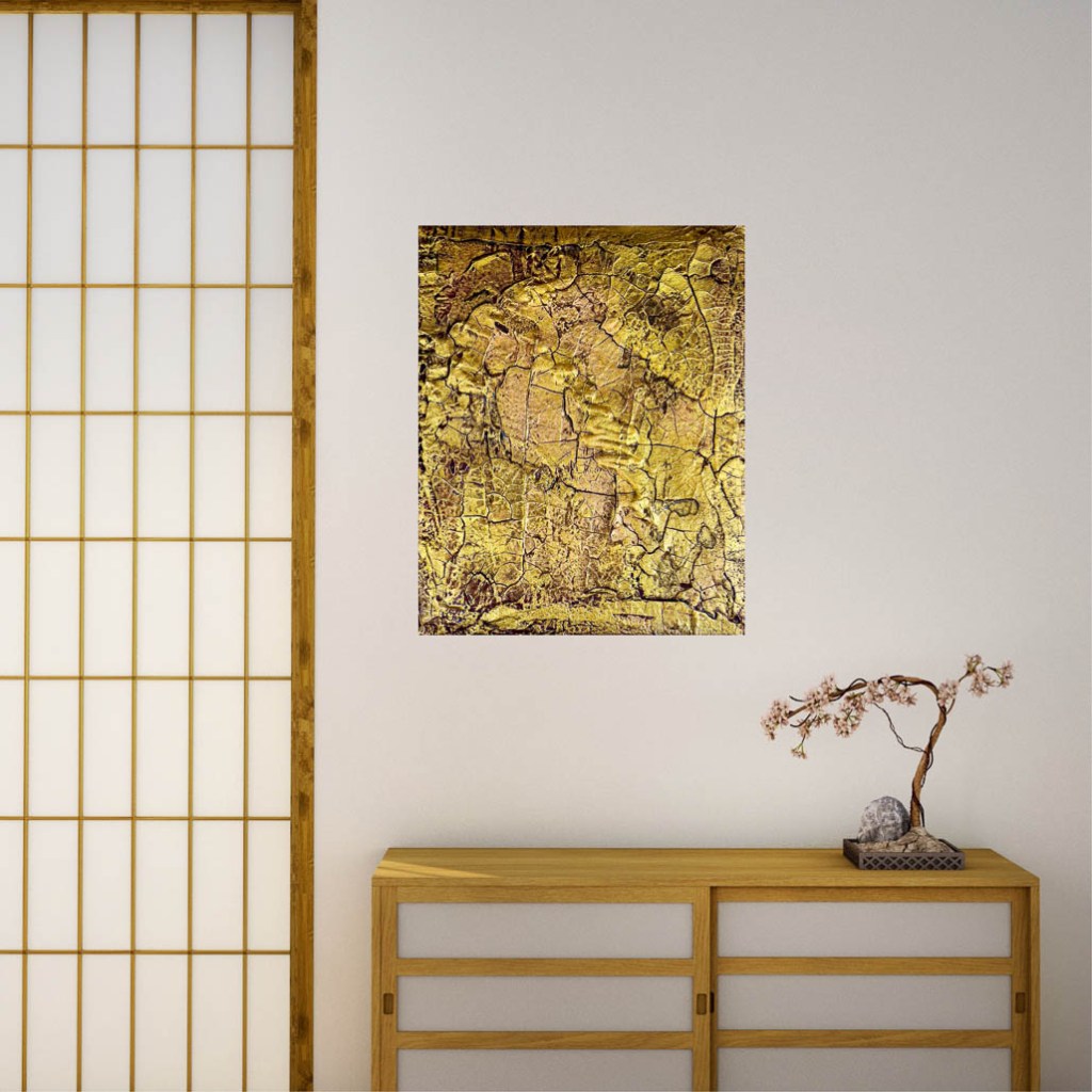 Eine Hommage an die flüchtigen Momente des Glücks und der Zuversicht. Das Bild „Goldene Zeiten“ ganz in Goldtönen gehalten, fängt die Essenz von Wärme und Geborgenheit ein, die die Seele in Zeiten der Dunkelheit erleuchtet. Die dreidimensionale Gestaltung mit ihren Höhen und Tiefen symbolisiert die Reise des Lebens, die uns durch verschiedenste Phasen führt. Doch nehmen wir diese goldenen Zeiten wirklich bewusst und wertschätzend wahr, wenn sie erleben? Diese Zeiten sind mehr als nur Phasen des Glücks; sie sind eine Kraftquelle, die uns durch dunkle Stunden trägt, sofern wir uns an das Glück erinnern, das gerade durch dunkle Wolken verhangen ist. „Goldene Zeiten“ ist nicht nur ein Kunstwerk, sondern auch eine Lebensphilosophie, die uns lehrt, die Schönheit jedes Moments zu schätzen und zu erkennen, dass nach jeder Finsternis im Leben ein goldener Sonnenschein folgt.