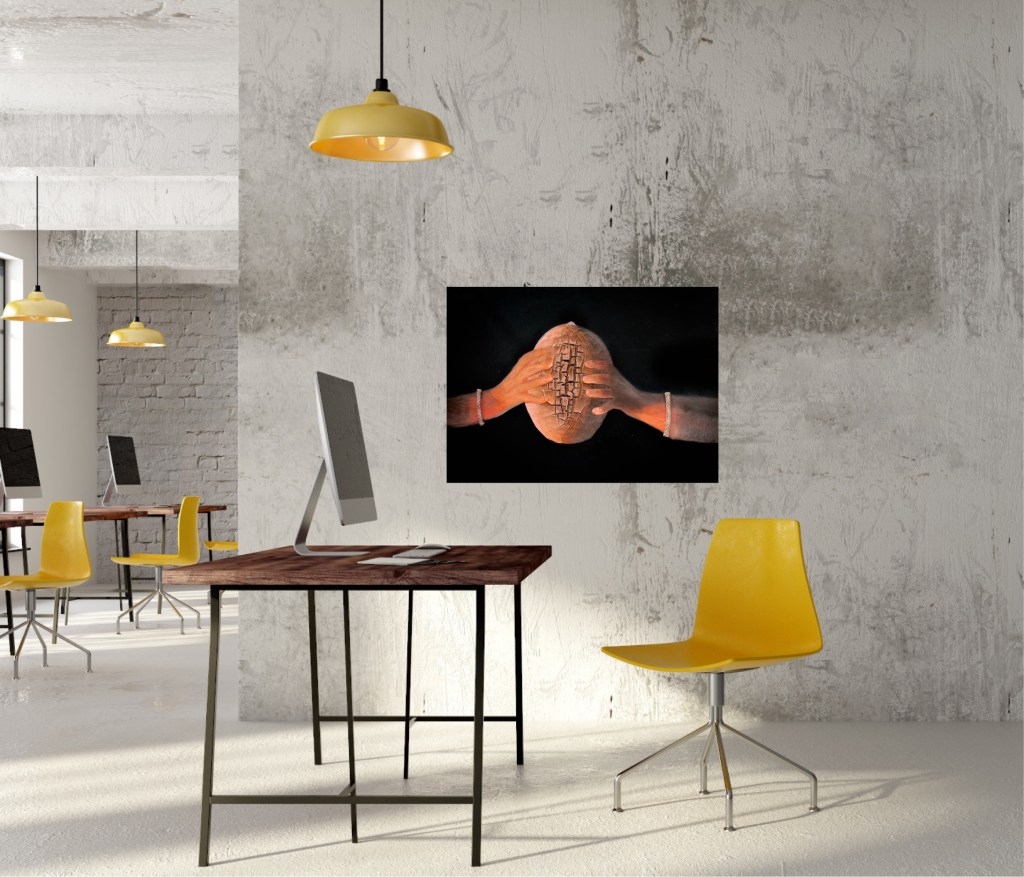 The artwork ‘The Horror’ shows from a bird’s eye view two hands clutching a bald head, creating deep furrows and wrinkles on its surface. This haunting depiction reflects an existential worry and fear, creating a disturbing atmosphere full of strain and fragility. The black background intensifies these oppressive emotions and draws the focus entirely onto the head and hands.