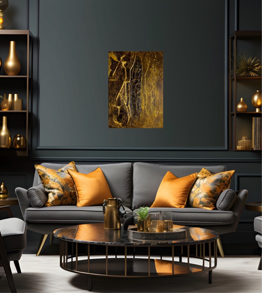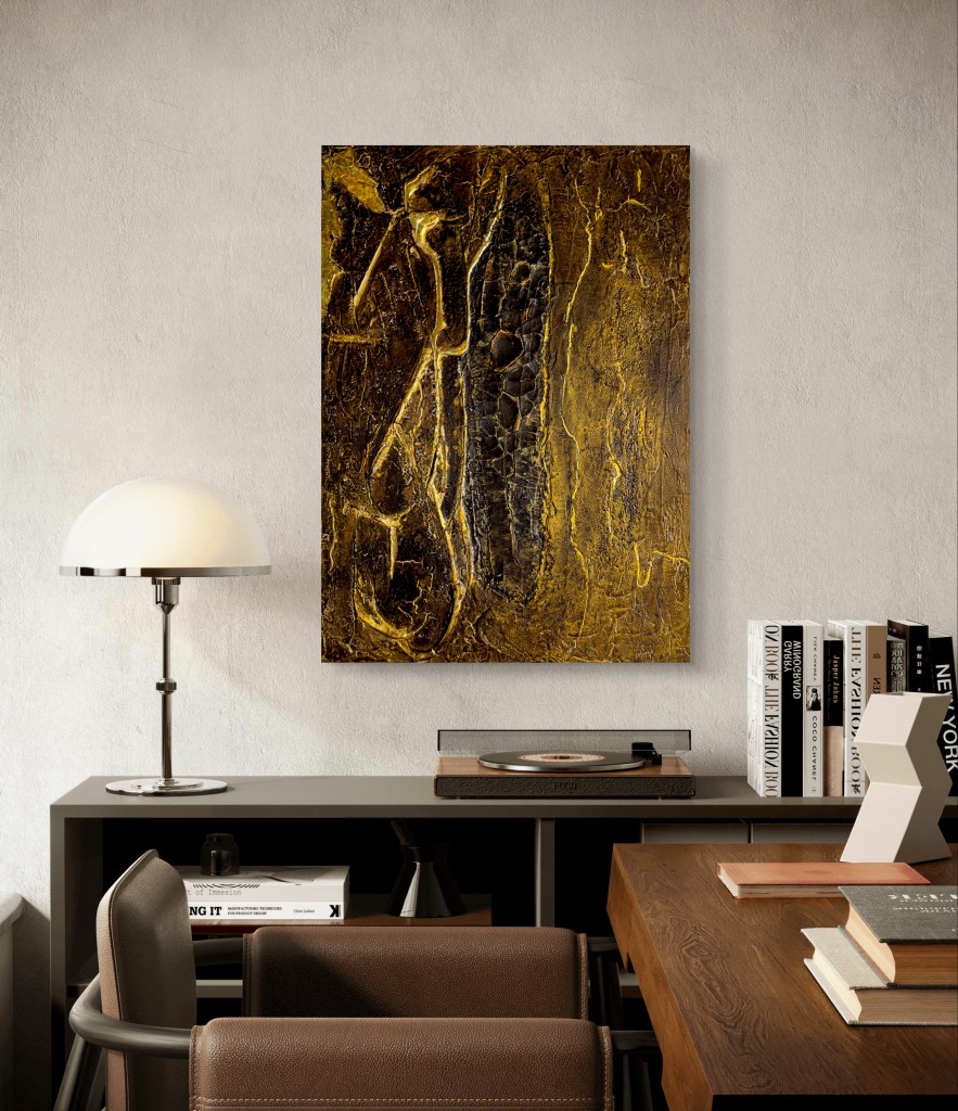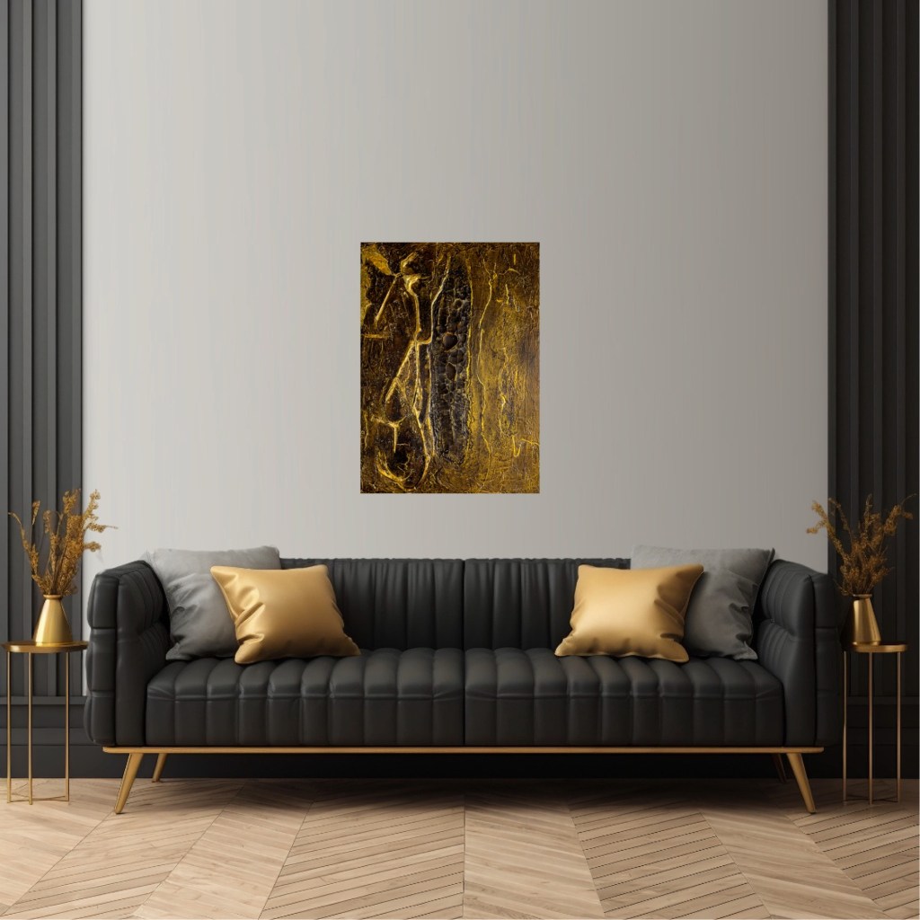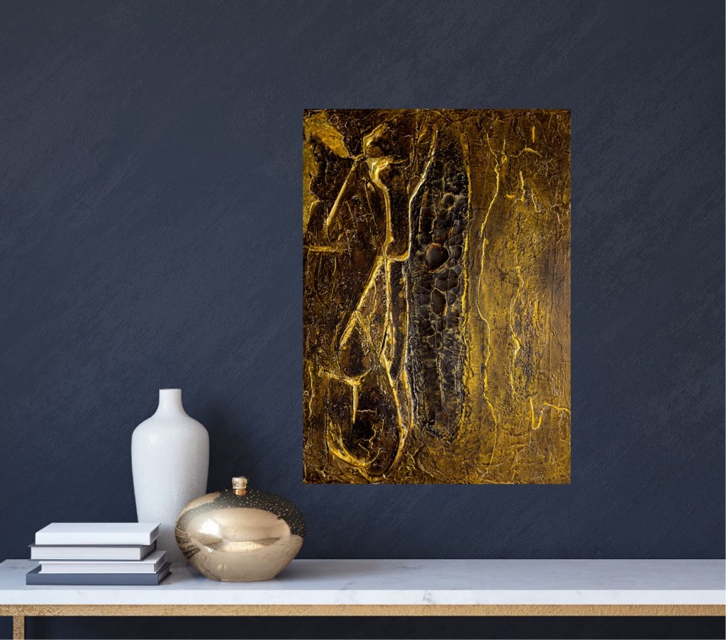 The golden accents add a dimension of richness and elegance that emphasise the preciousness of silence in a hectic world. ‘Silence is Golden’ invites the viewer to pause and experience the meditative quality of silence while exploring the subtle details and structures of the painting.