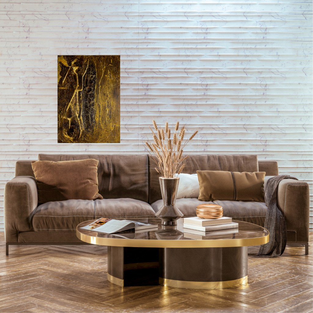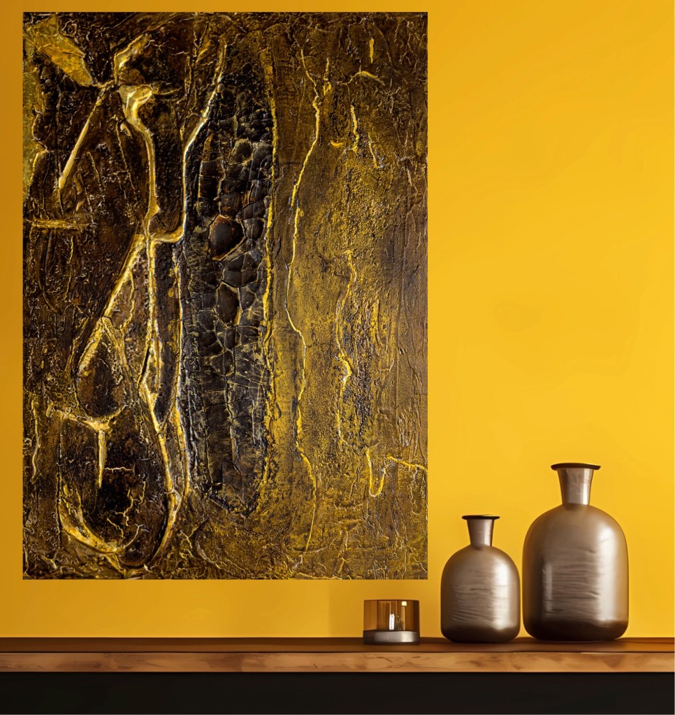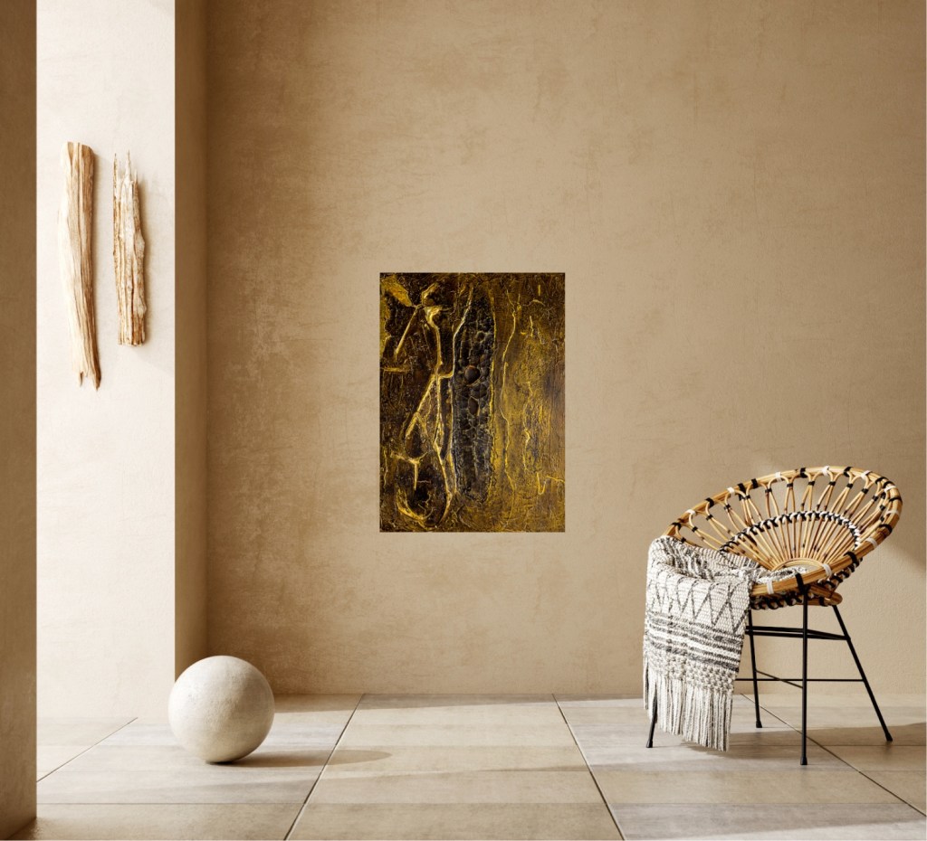 The artwork ‘Silence is Golden’ presents a warm colour palette of browns and golds that evoke a calm and contemplative mood. The textures, characterised by cracked and layered surfaces, give the work a beautiful depth. It evokes the distinctiveness and complexity of ‘silence’.