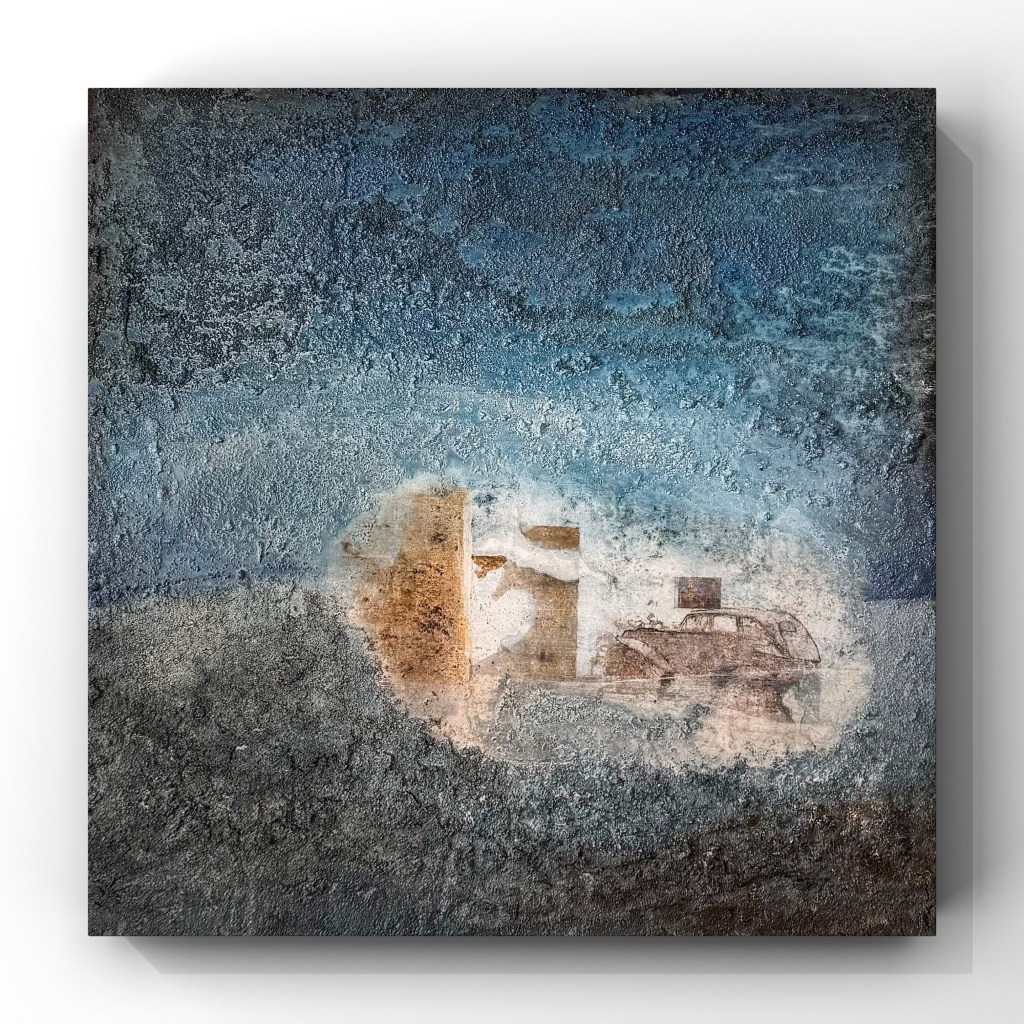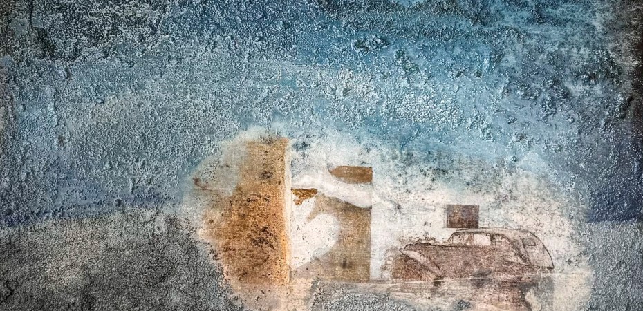 En el centro del cuadro hay un viejo vehículo abandonado. Las formas y líneas de estos elementos sólo son tenuemente visibles, lo que estimula la imaginación del espectador y deja margen para la interpretación. Parece como si el pasado intentara penetrar a través de las capas del tiempo, reforzando la sensación de fugacidad.