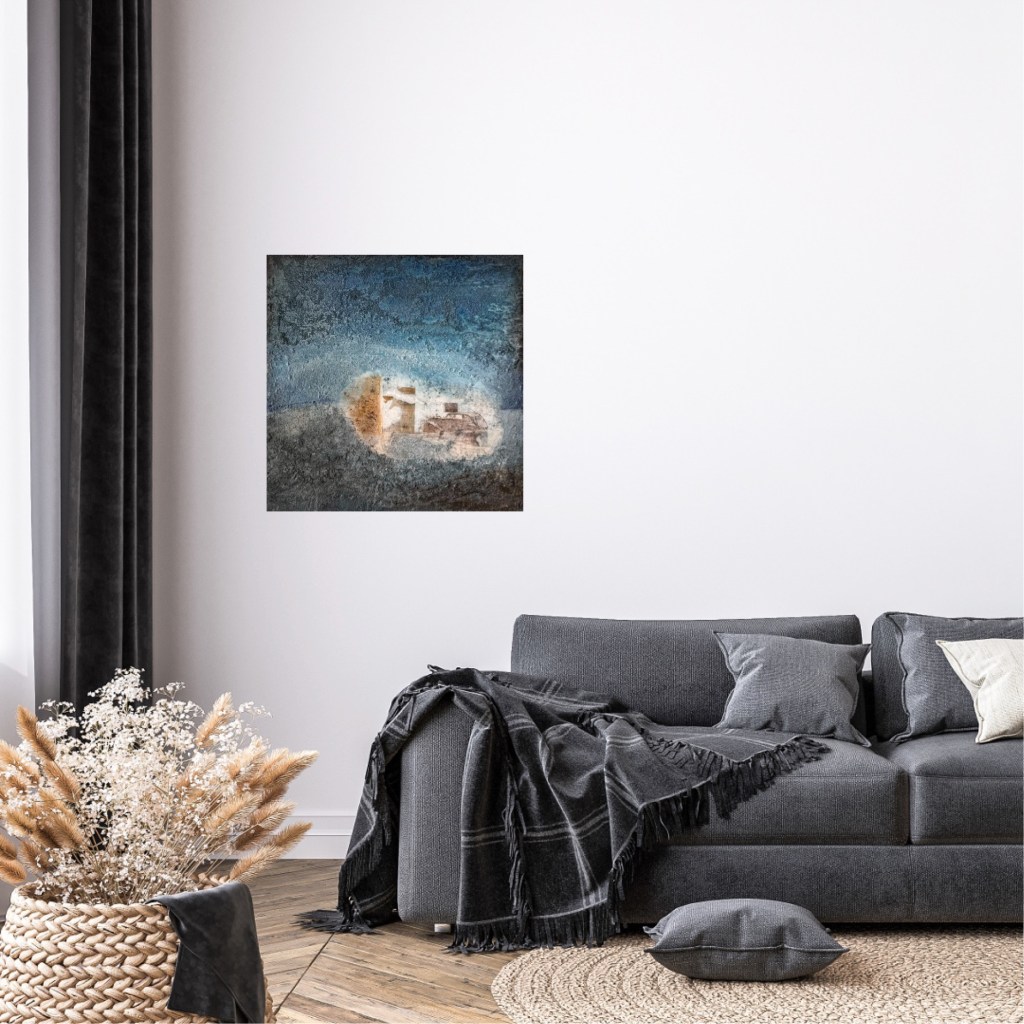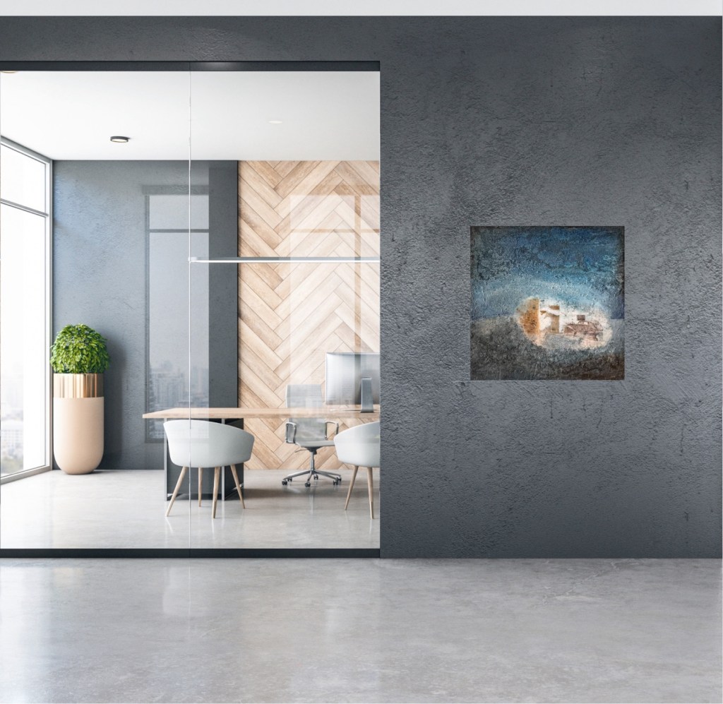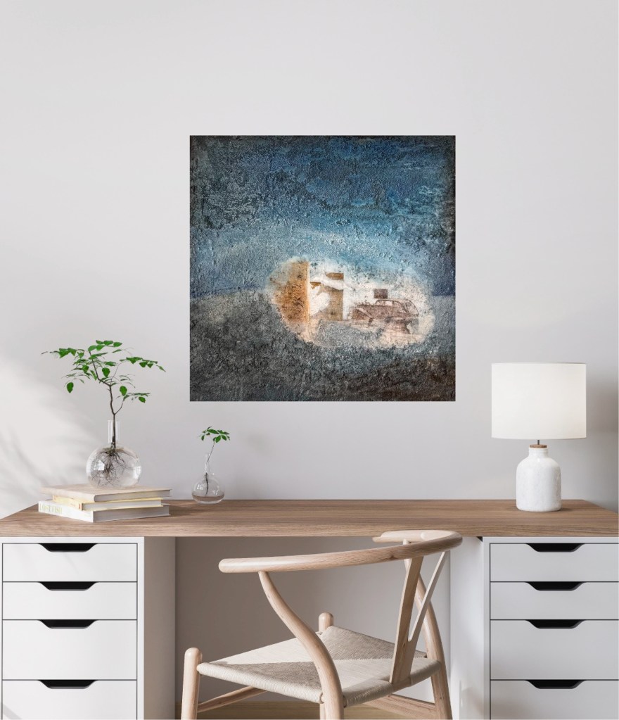 The painting ‘Disused’ shows a scene of decay and nostalgia. The weathered and structurally degraded surface and the use of blue and grey tones create a feeling of coldness and loneliness in the viewer.