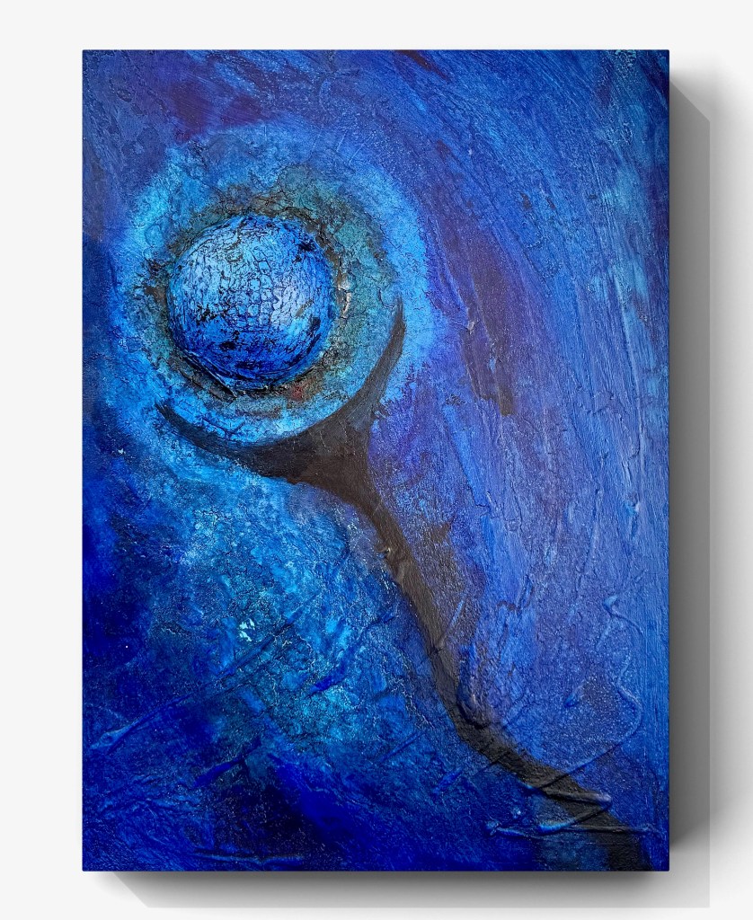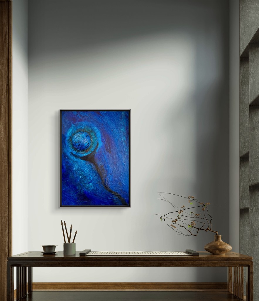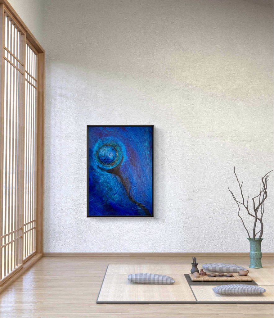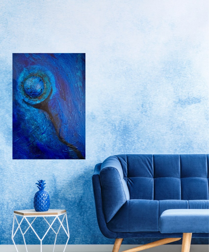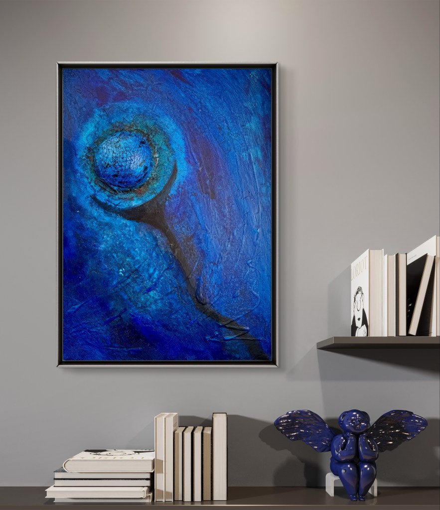 La obra de arte „El globo azul » muestra una representación abstracta en varios tonos intensos de azul. En el centro del cuadro hay una estructura esférica que recuerda a un globo y está acentuada por fuertes texturas en forma de red. Una sombra oscura en forma de media luna corre hacia abajo, mientras que el fondo es de vivos tonos azules, lo que da a la obra profundidad y movimiento. La combinación de formas y colores transmite una atmósfera casi cósmica que acentúa el carácter flotante del globo.