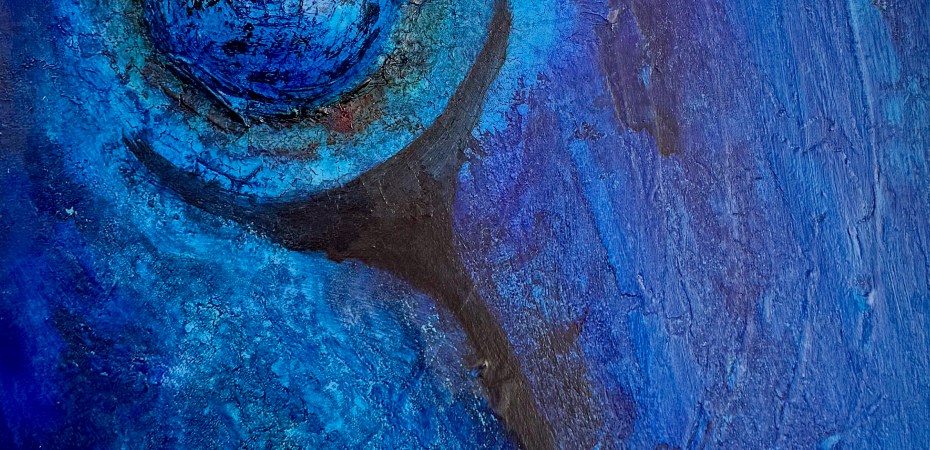 The artwork ‘The Blue Balloon’ shows an abstract representation in various intense shades of blue. At the centre of the painting is a spherical structure resembling a balloon, highlighted by bold reticulated textures. A dark crescent-shaped shadow extends downwards, while the background is kept in vibrant shades of blue, giving the work depth and movement. The combination of shapes and colours creates an atmospheric and almost cosmic mood that emphasises the floating character of the balloon.