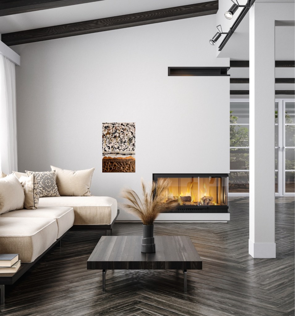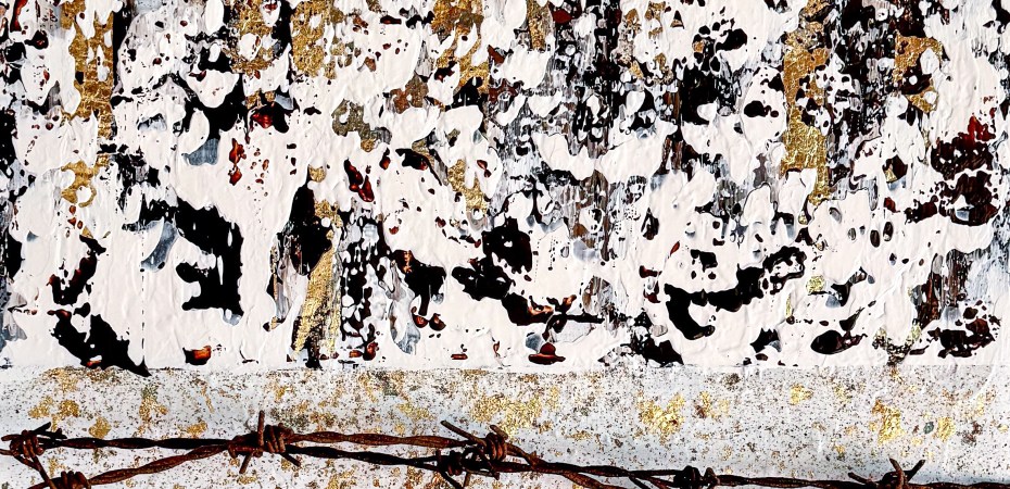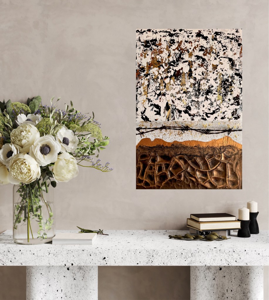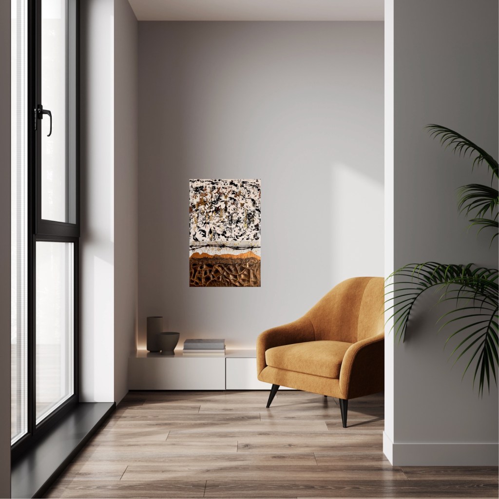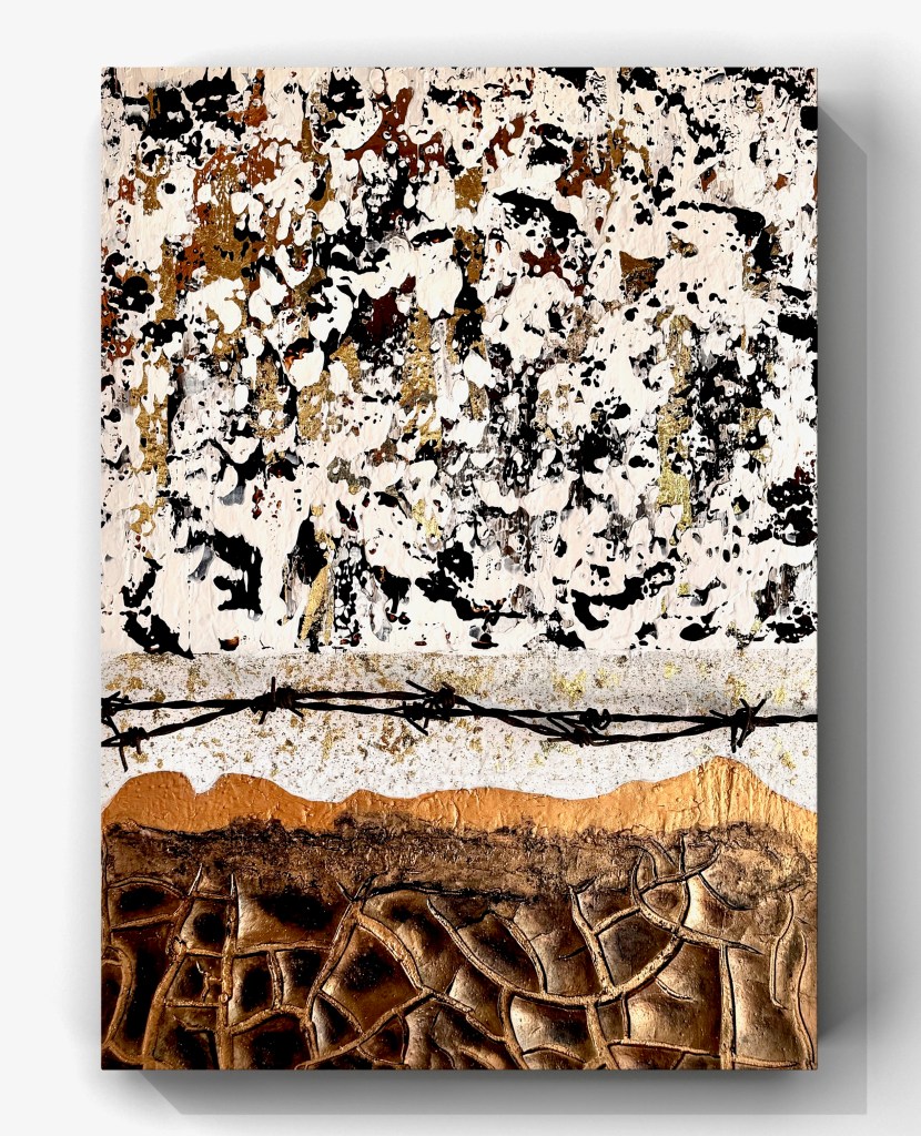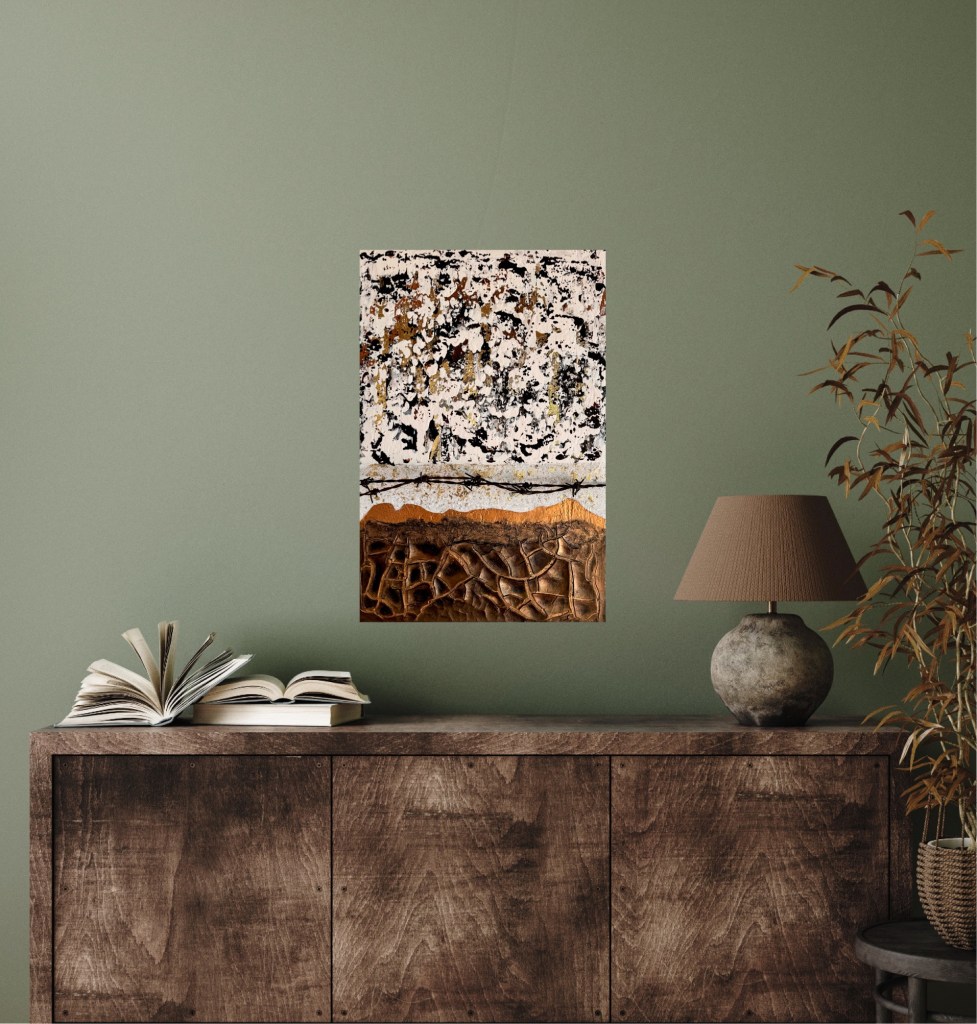 The artwork ‘(Dis-)Harmony’ is a powerful juxtaposition of contrasts. The upper section is dominated by chaotic, speckled structures in black, white and gold, which convey a restless, almost fragmented atmosphere. A rusty barbed wire line runs between them, which could symbolise separation or demarcation. The lower part of the picture shows earthy brown tones with strongly structured, cracked forms that are reminiscent of a dry, breaking landscape. The interplay of the elements reflects the ambivalence between order and chaos, harmony and conflict – elements of the human emotional spectrum.