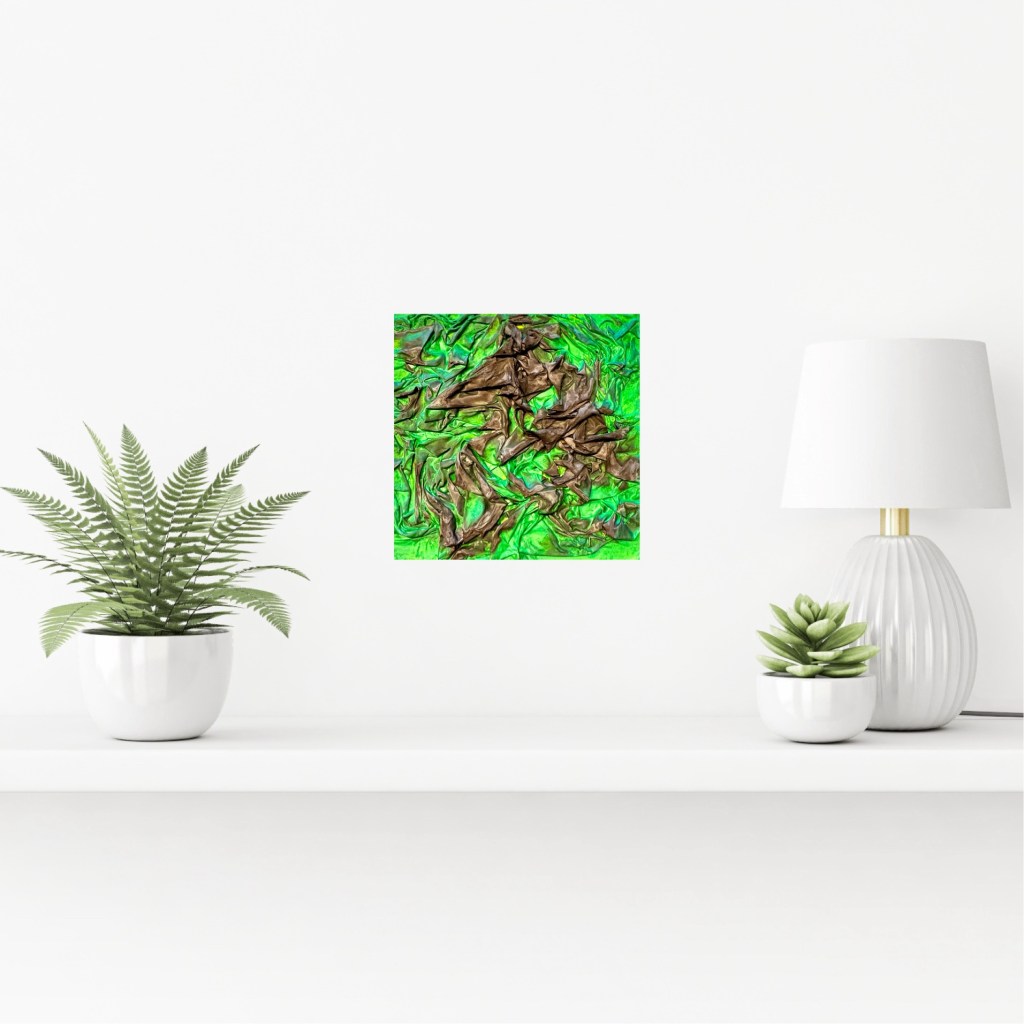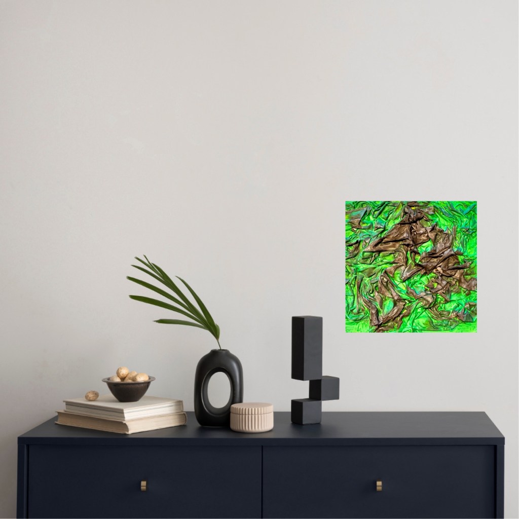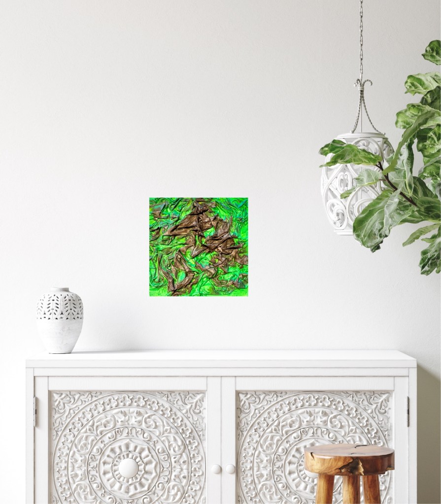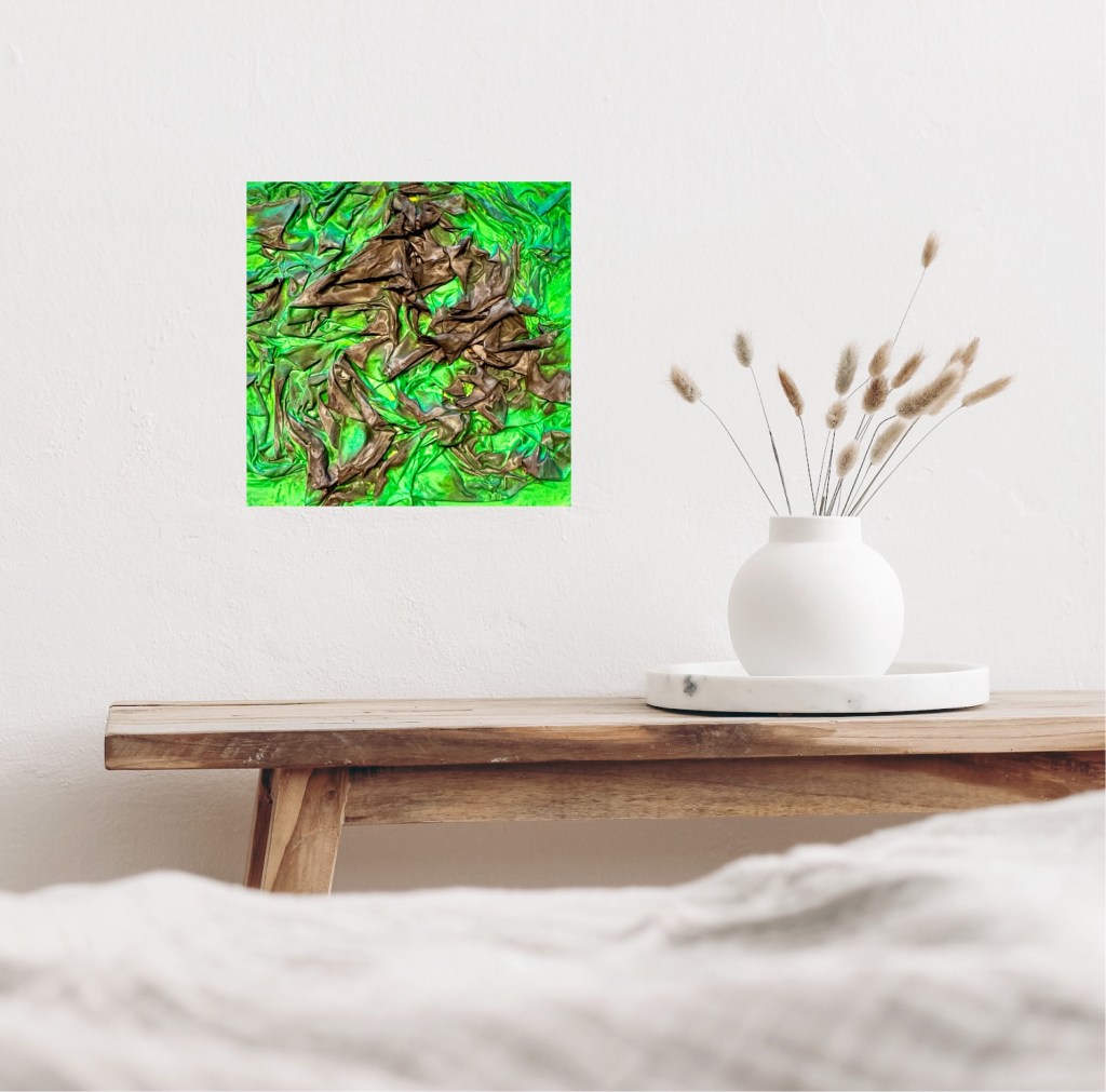The artwork ‘Burnout’ shows a complex texture of crumpled fabric in various shades of brown, spread across a bright green background. The folds and creases in the material appear chaotic and convey a sense of tension and restlessness. The combination of the organic-looking dark elements with the intense, almost neon-like green colour creates a contrasting and exciting atmosphere that visually reflects the title ‘Burnout’. The composition conveys a sense of exhaustion and disintegration and hints at the emotional and physical effects of excessive demands and stress.