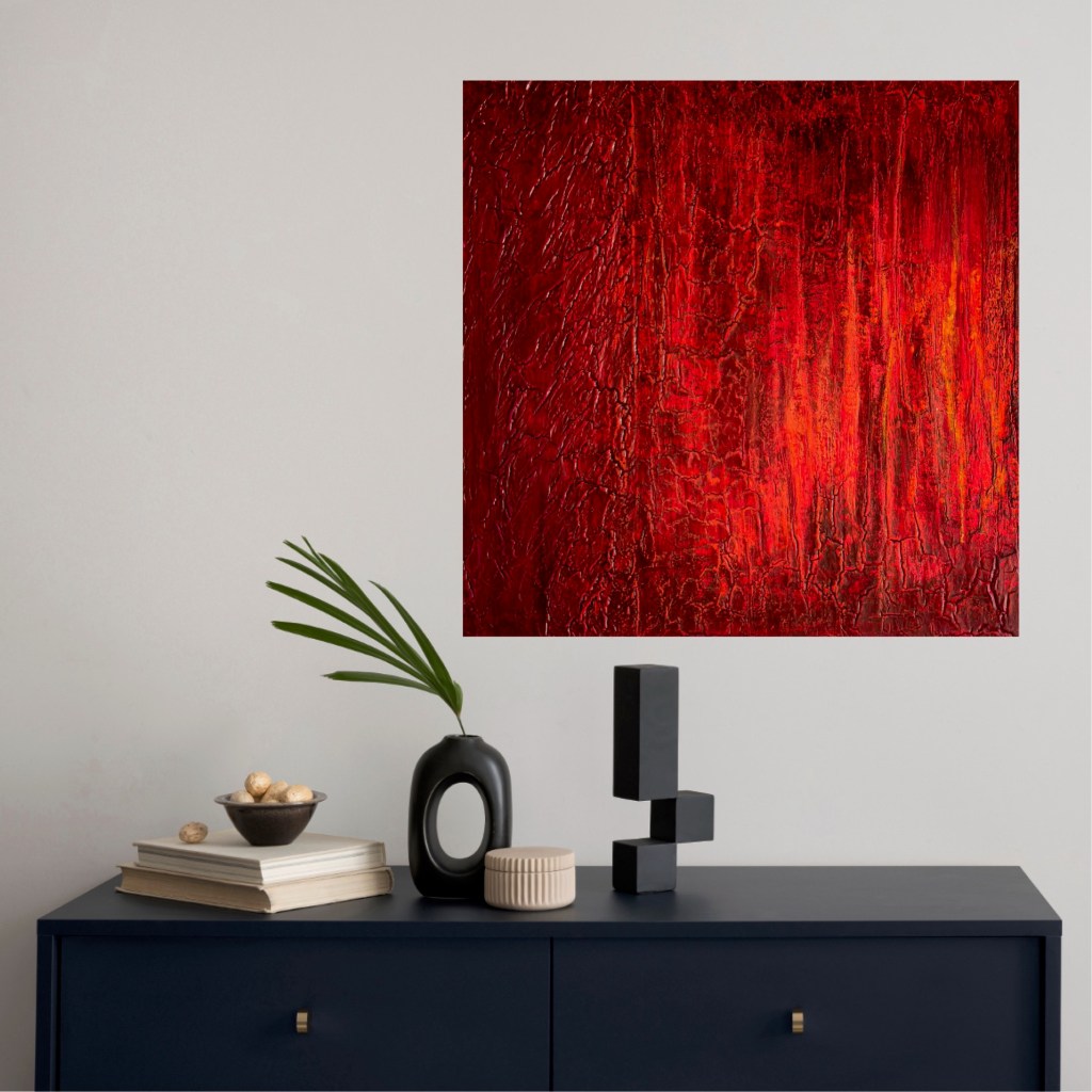 The artwork ‘Lava Stream’ shows a powerful representation of flowing and glowing forms, in deep reds and dark blacks. The structure of the painting evokes the movement and intensity of a lava flow as it makes its way. The bold, layered brushstrokes and intense colour palette create a sense of heat and unstoppable force of nature. The textures make the surface look like solidified magma, interrupted by liquid, fiery elements that capture the raw energy of lava.