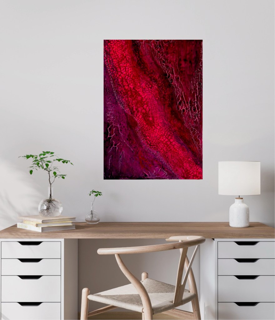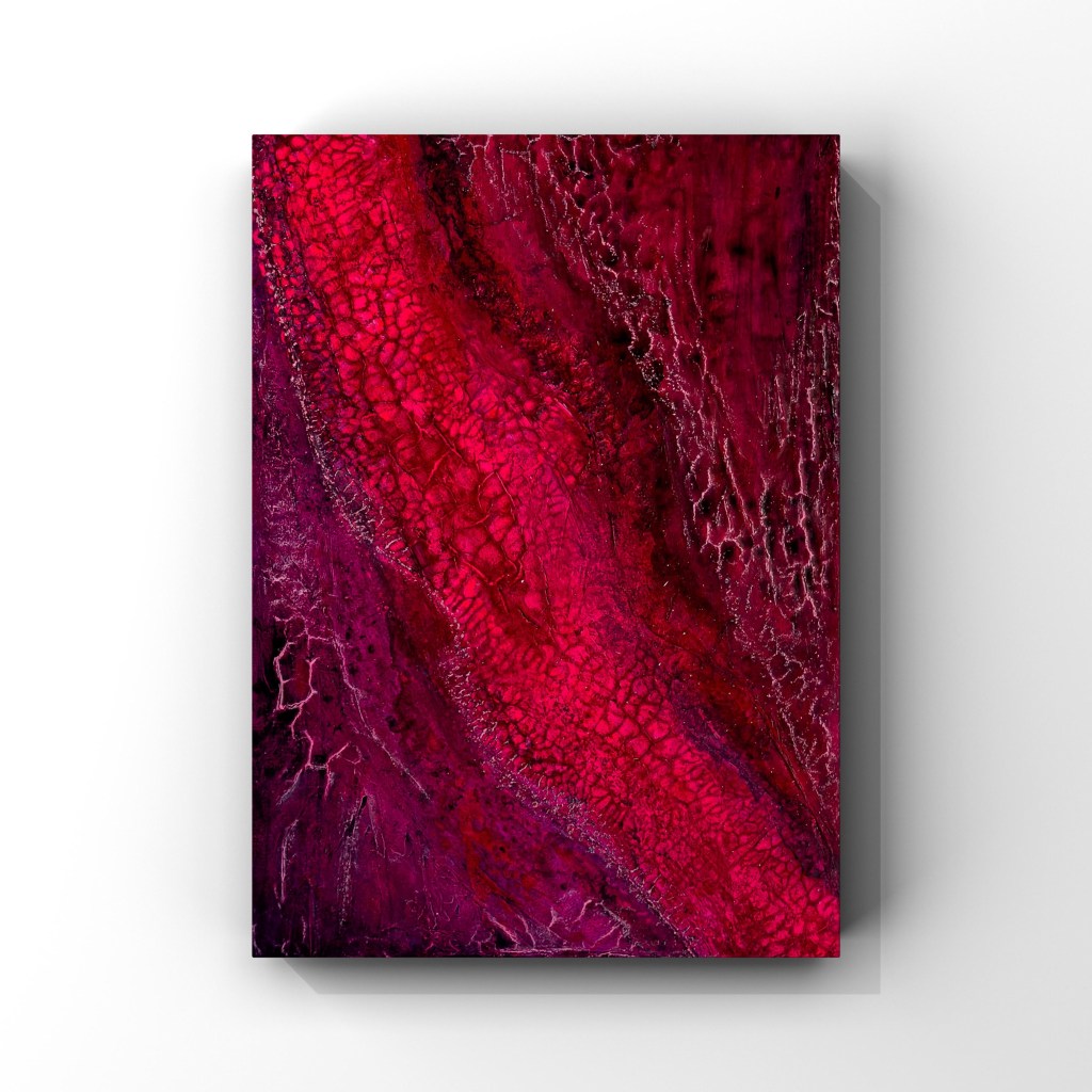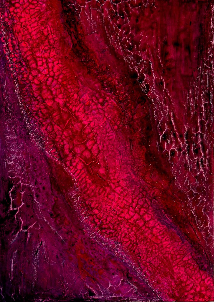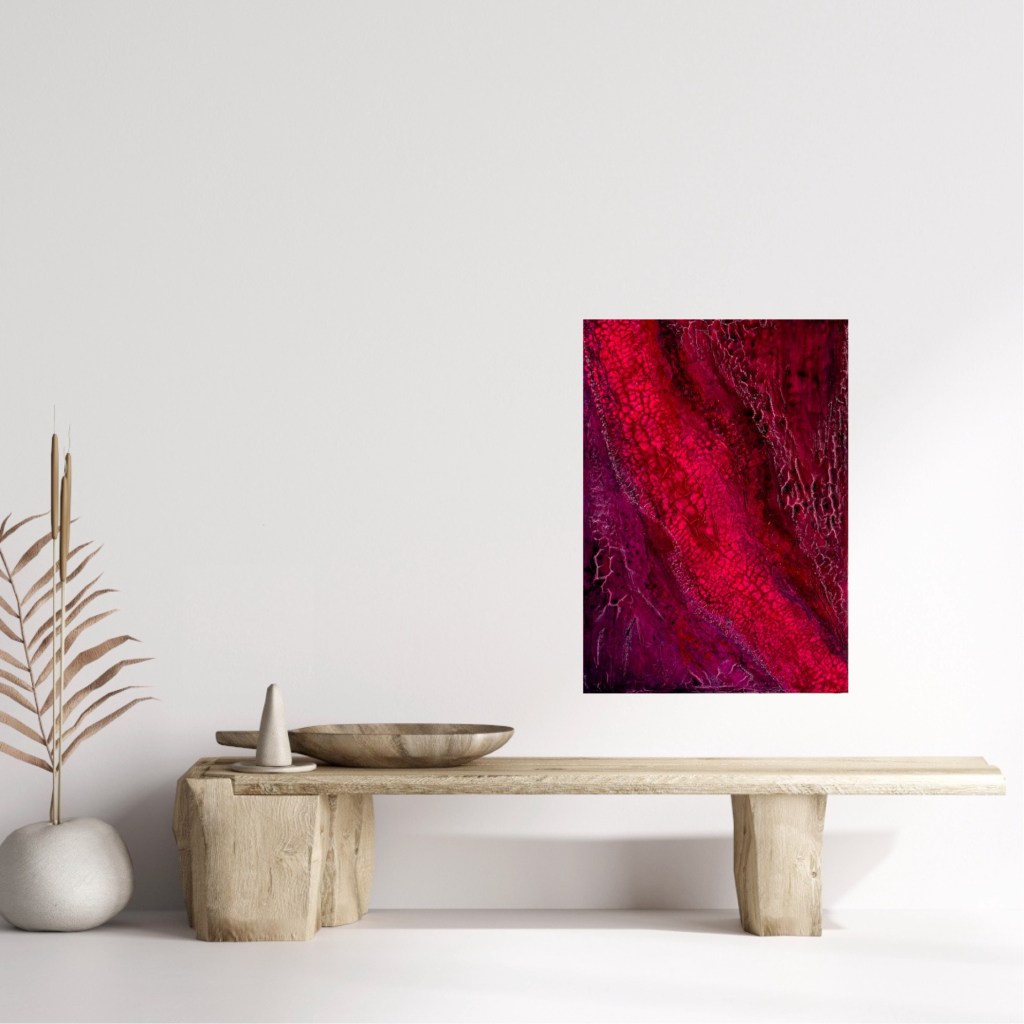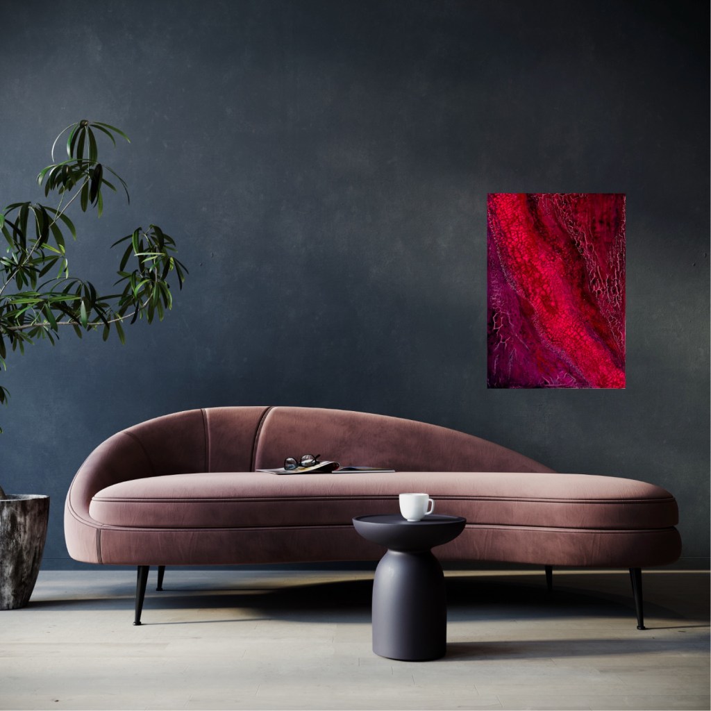 La obra «Good Feeling» cautiva por su intensa paleta de colores y su complejidad estructural. Los tonos rojos y morados dominantes crean una atmósfera cálida y apasionada. La textura del cuadro, con sus superficies agrietadas y estratificadas, transmite una sensación de profundidad y movimiento. Esta obra invita al espectador a adentrarse en las capas emocionales y la dinámica energética que evocan el positivo y vigorizante «Good Feeling». Es una obra poderosa que irradia fuerza y vitalidad.