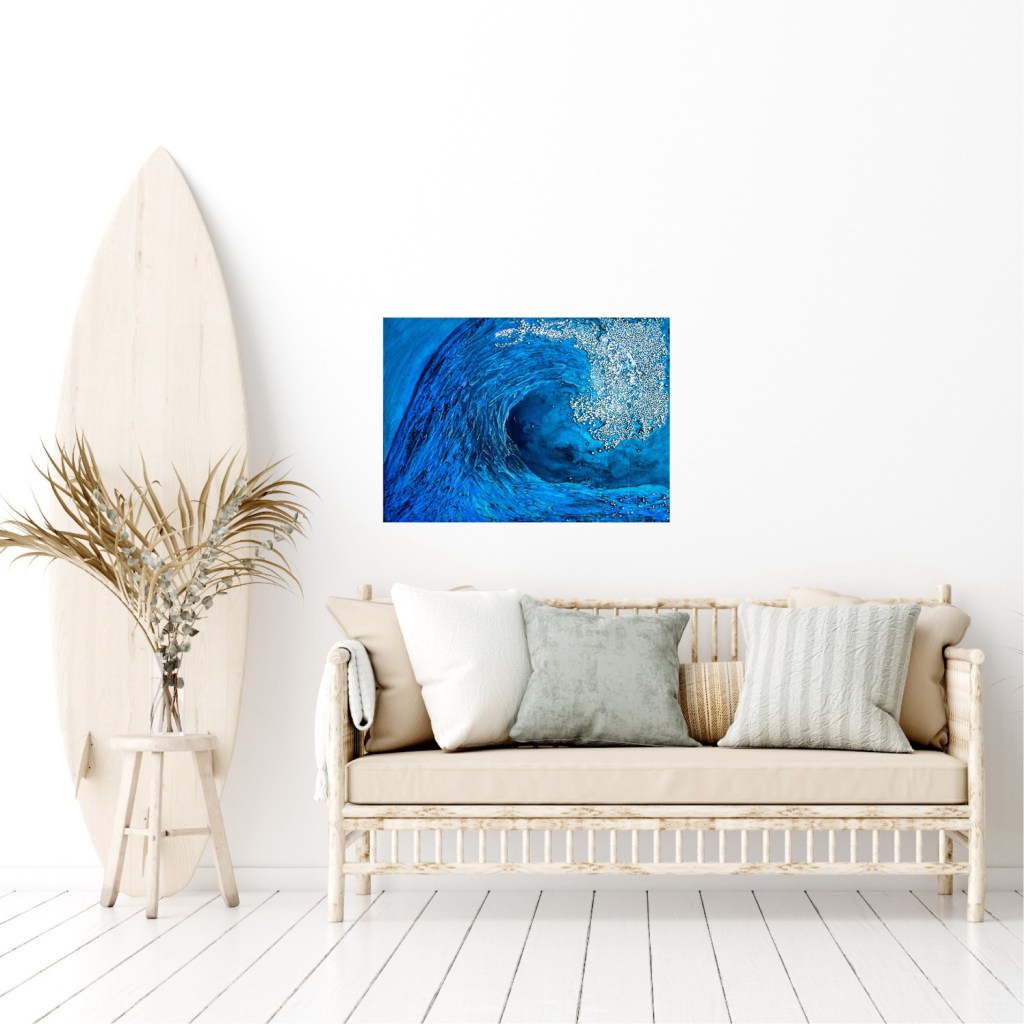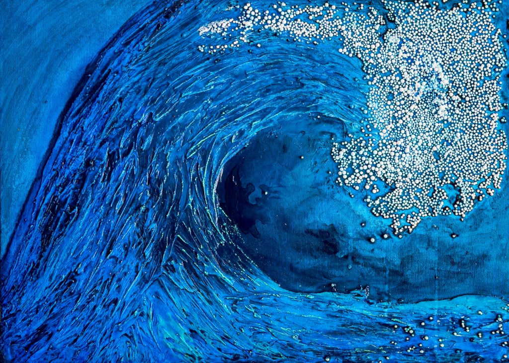 The painting ‘Sea Wave’ shows a dynamic, abstract depiction of a wave in various shades of blue. The wave movement is emphasised by curved, textured brushstrokes that convey a powerful and lively energy. The upper part of the wave is decorated with numerous small white dots that look like spray or foam and give the painting a special lightness and movement. The intense colour palette and the three-dimensional structure of the artwork create a fascinating depth effect that impressively captures the power and beauty of the sea.