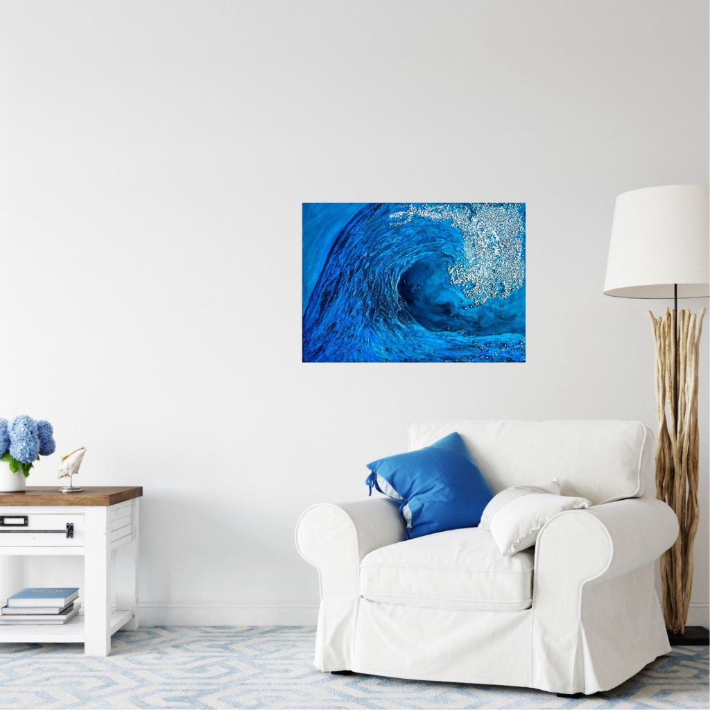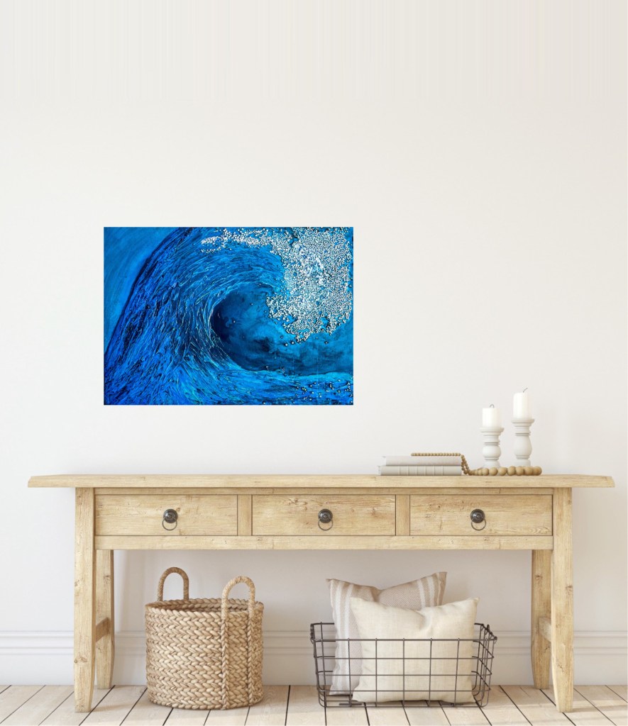 El cuadro «Ola de mar» muestra una representación dinámica y abstracta de una ola en varios tonos de azul. El movimiento de la ola se acentúa con pinceladas curvas y texturadas que transmiten una energía poderosa y viva. La parte superior de la ola está decorada con numerosos puntitos blancos que parecen aerosoles o espuma y confieren al cuadro una ligereza y un movimiento especiales. La intensa paleta de colores y la estructura tridimensional de la obra crean un fascinante efecto de profundidad que capta de forma impresionante la fuerza y la belleza del mar.
