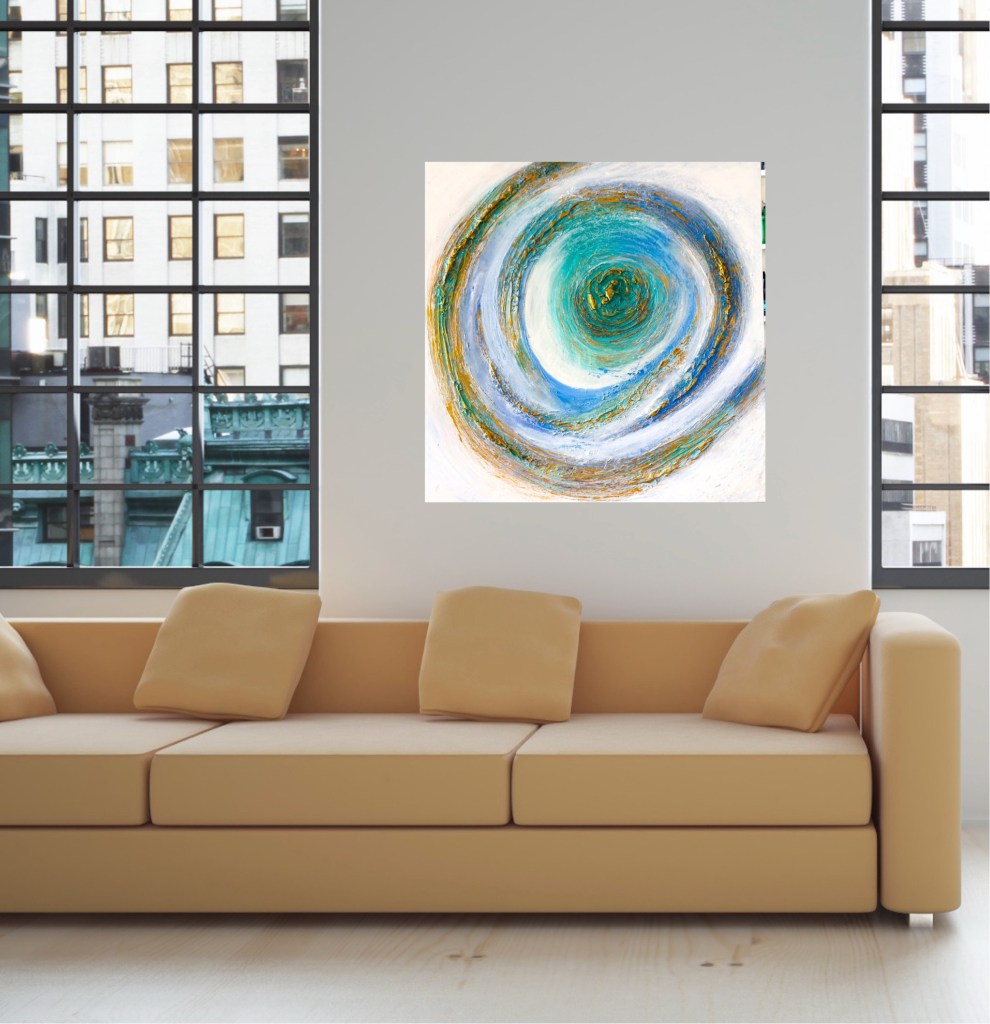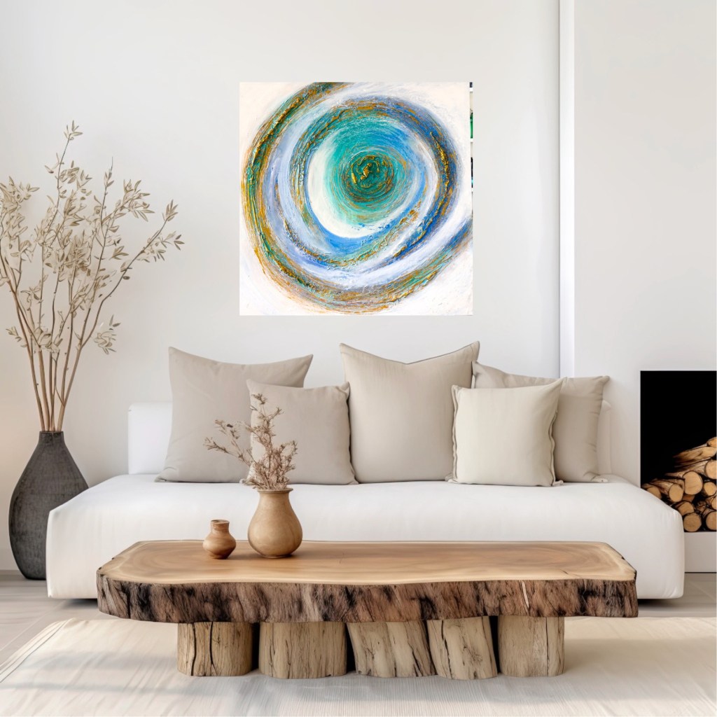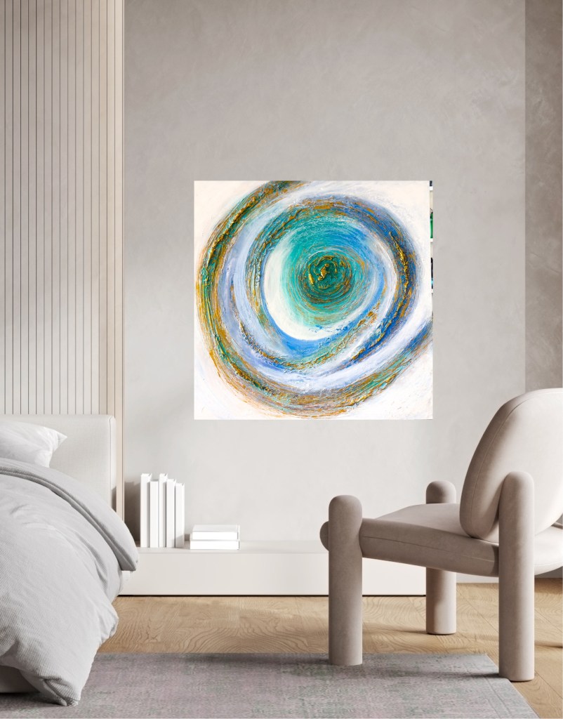 This vibrant artwork, entitled ‘Joy’, captures the essence of happiness and positive energy. The dynamic swirling movements and powerful colours in shades of blue, green and gold symbolise a vortex of joy and vitality. The textures and the use of light and shadow create a deep spatial effect that draws the viewer into the centre of joy. The work radiates a warm and welcoming atmosphere and invites one to let oneself be carried away by positive emotions.