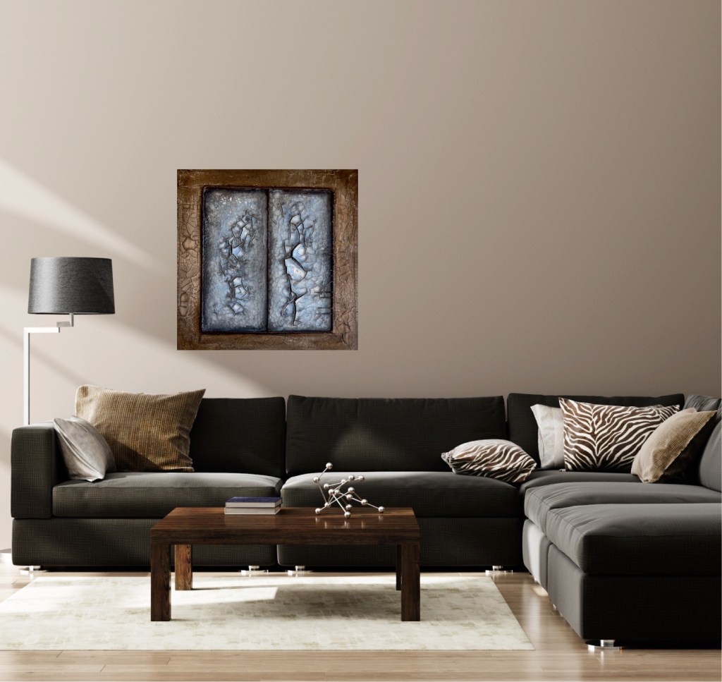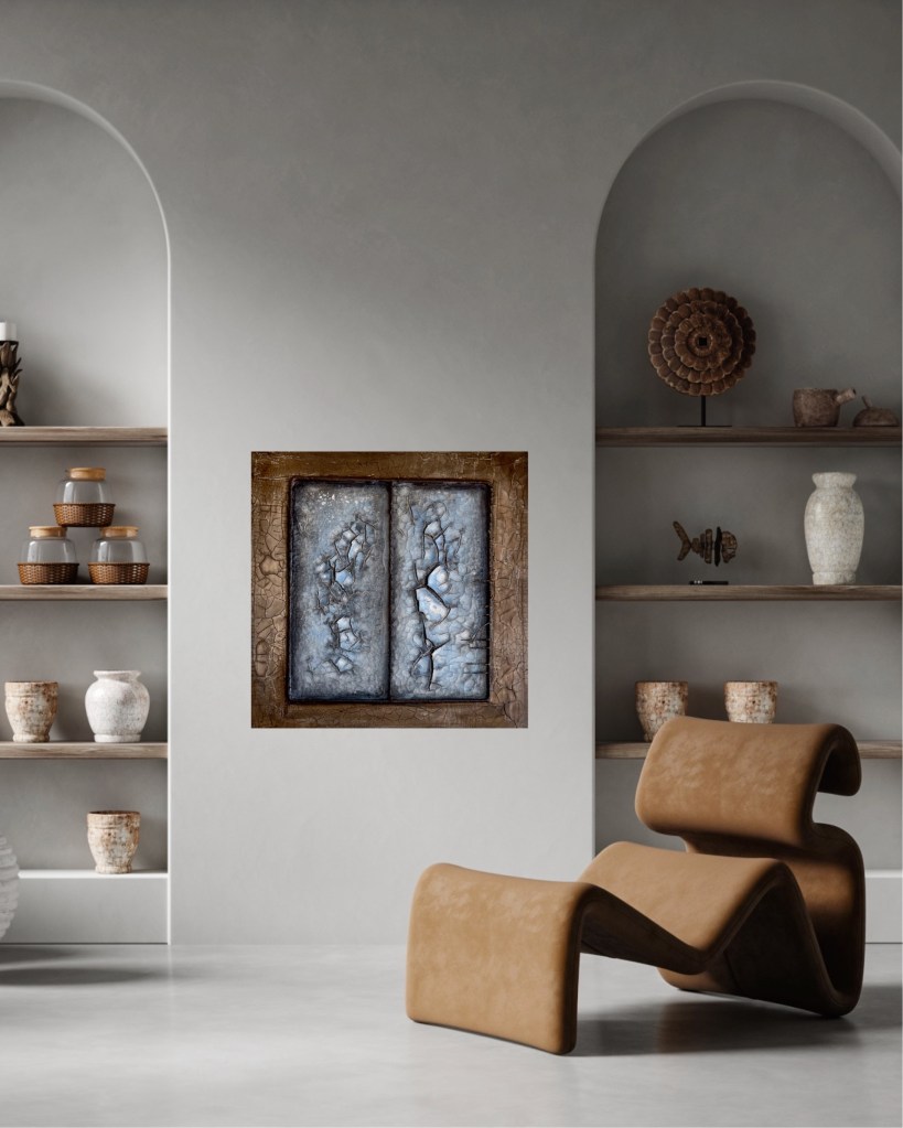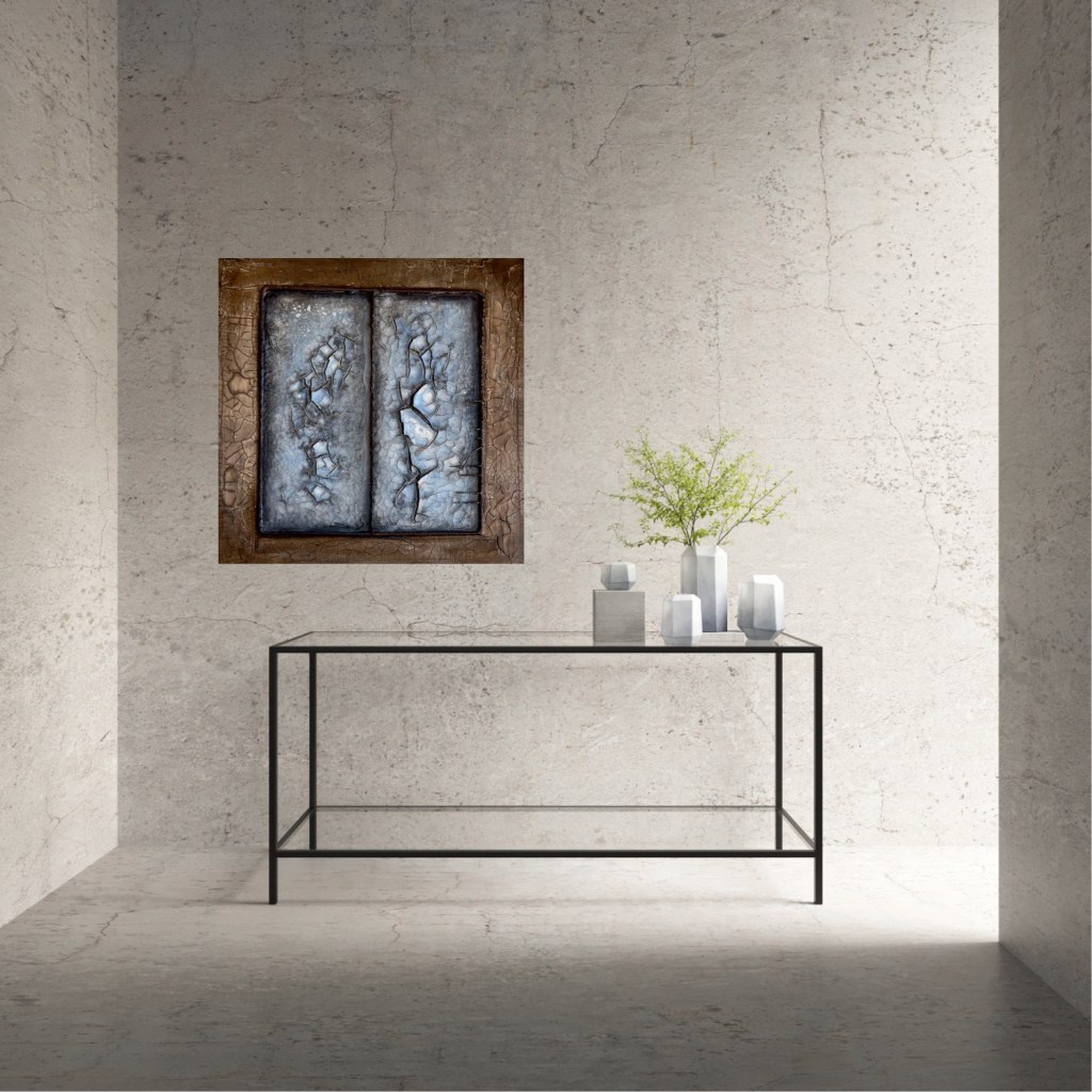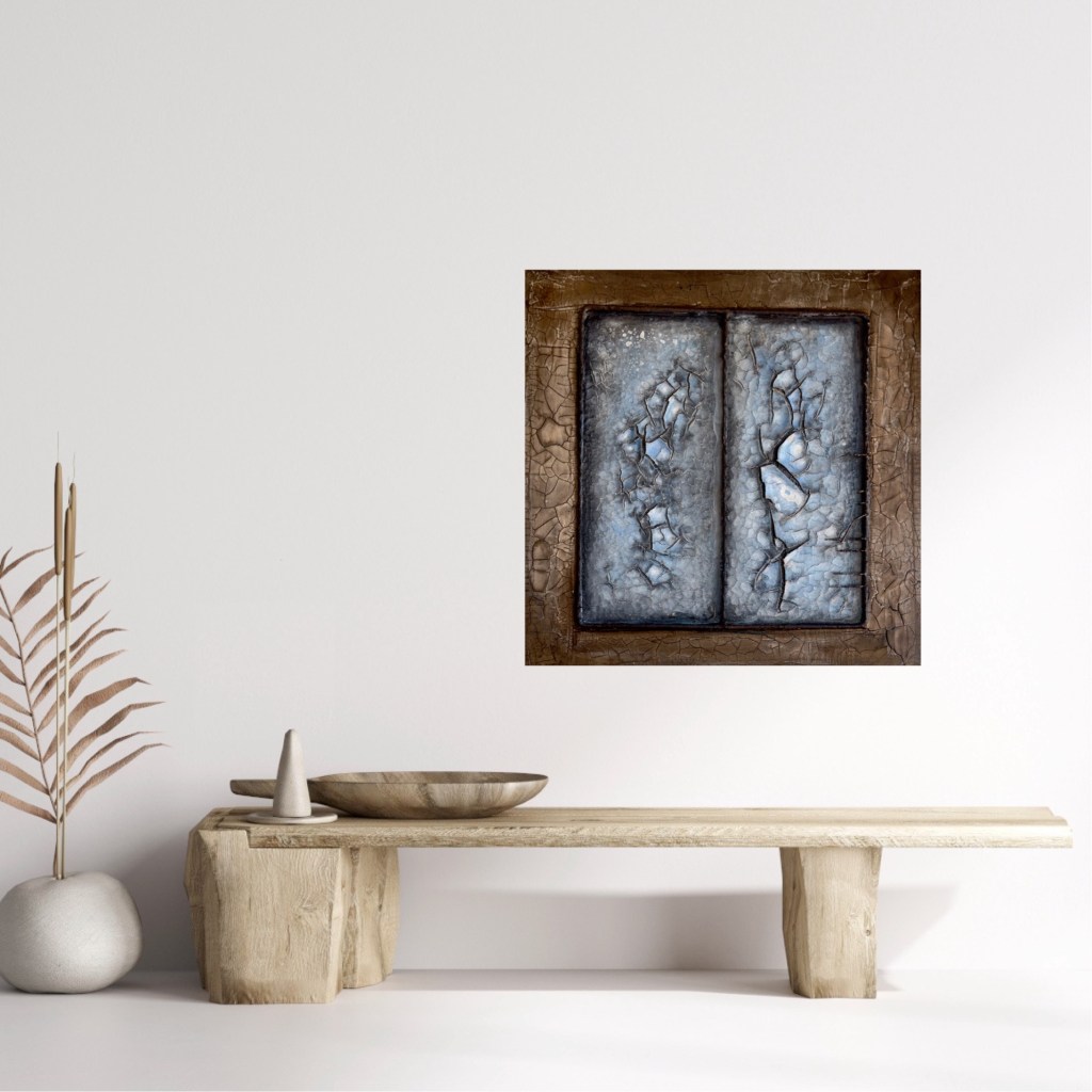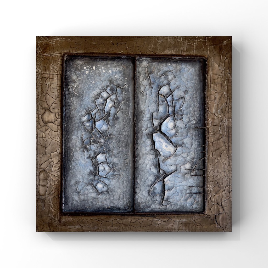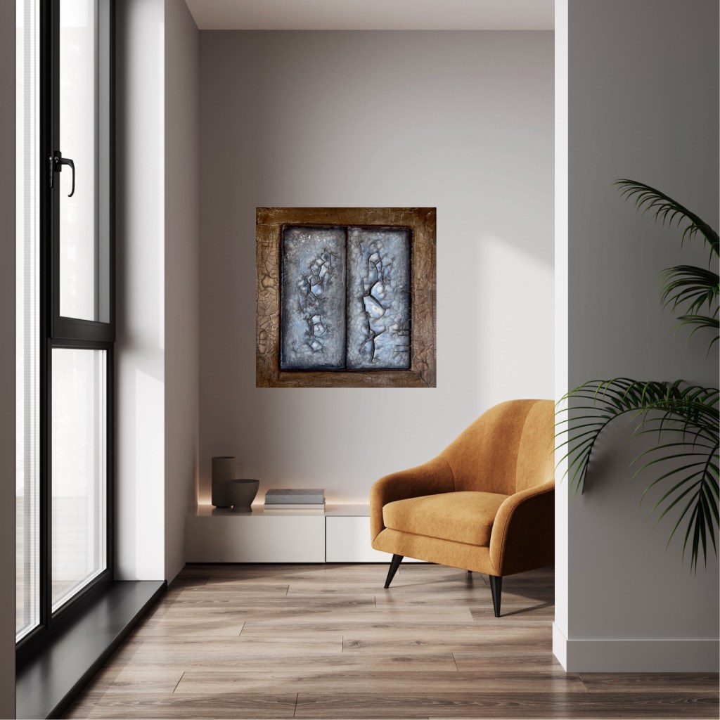 The painting ‘Broken Window’ symbolises fragility and decay. The cracks and fractures in the window panes not only symbolise physical damage, but are also a metaphor for broken experiences and emotions, failed decisions or ‘clouded’ perception. The combination of cold, blue-grey tones and the rough texture possibly creates an atmosphere of melancholy. Despite the weathering of the panes, the light shining in is simultaneously encouraging and invites us to reflect on our own experiences.