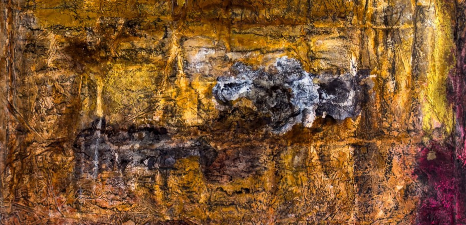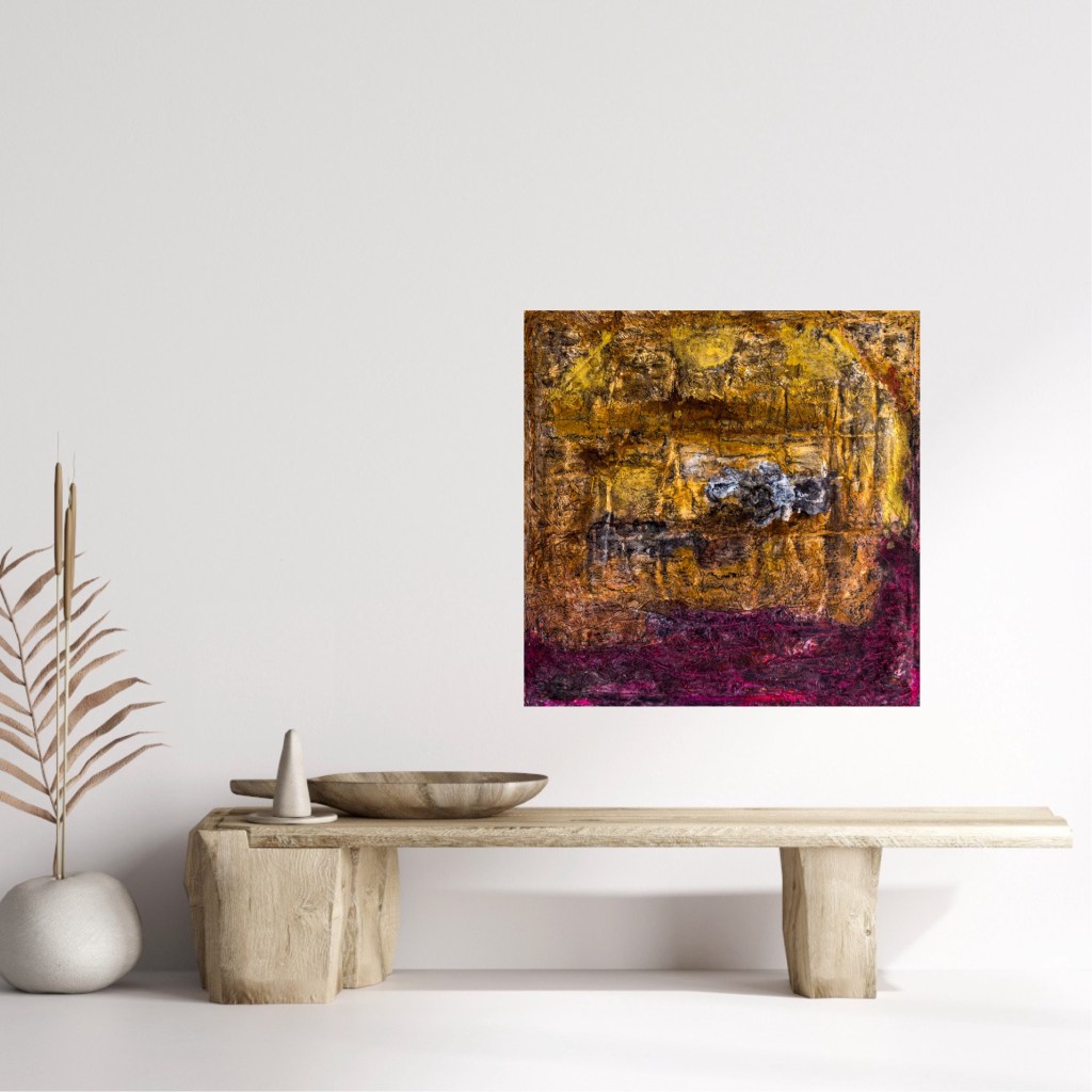 La obra «Sueños orientales» es un cuadro abstracto que juega con colores y texturas intensos para crear una atmósfera onírica de inspiración oriental. Los tonos dorados y ocres dominantes impregnan la superficie del cuadro y recuerdan a muros antiguos o a paisajes desérticos que brillan bajo la luz del sol. Elementos negros y grises rompen la superficie y crean contrastes que podrían recordar a juegos de sombras. En la parte inferior del cuadro se aprecian tonos rojos, profundos y cálidos, que recuerdan a alfombras o telas orientales y confieren al cuadro una calidez terrenal. La estructura y la estratificación de la aplicación del color dan a la obra un efecto vivo e invitan al espectador a sumergirse en un mundo lejano y místico.