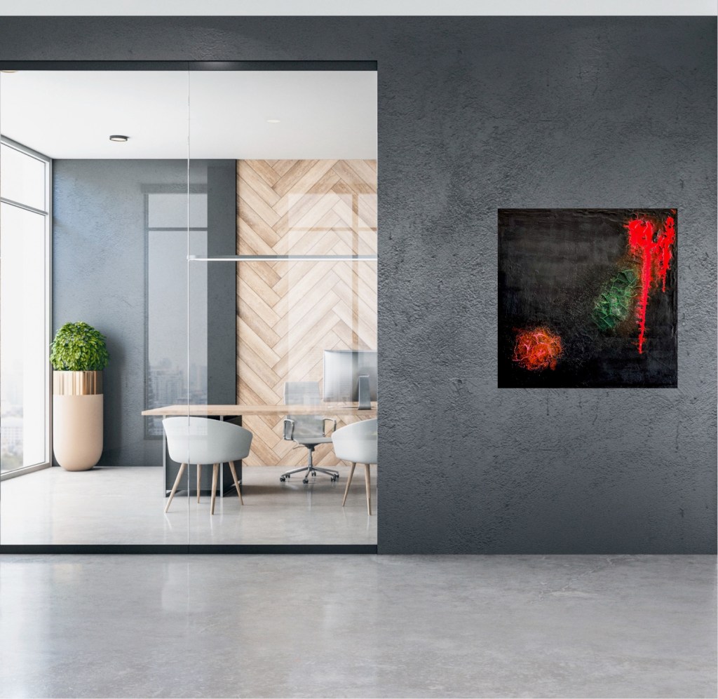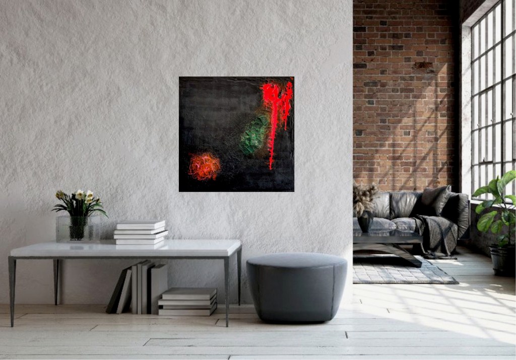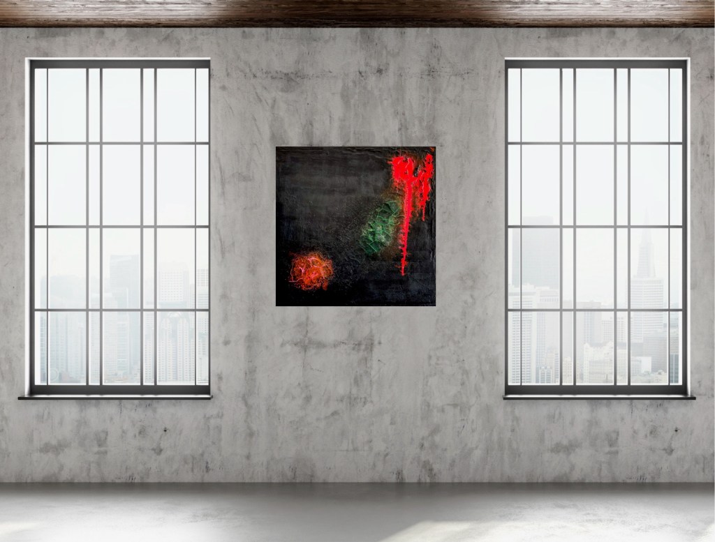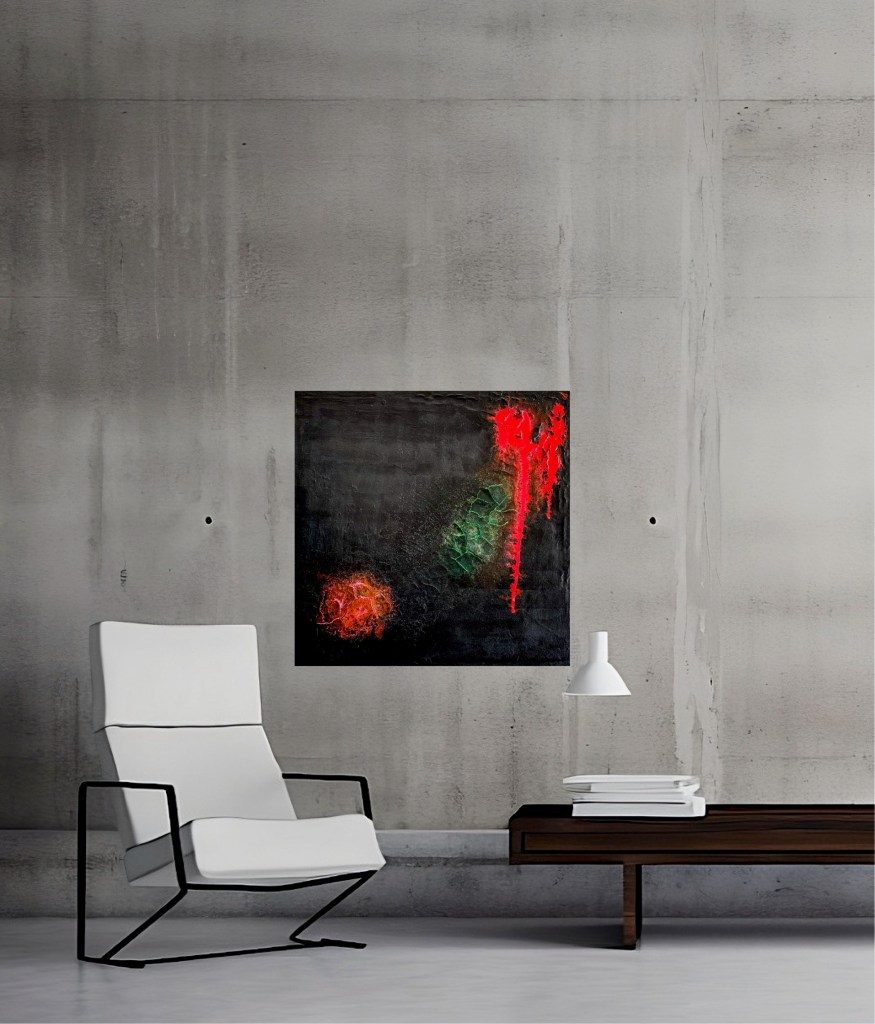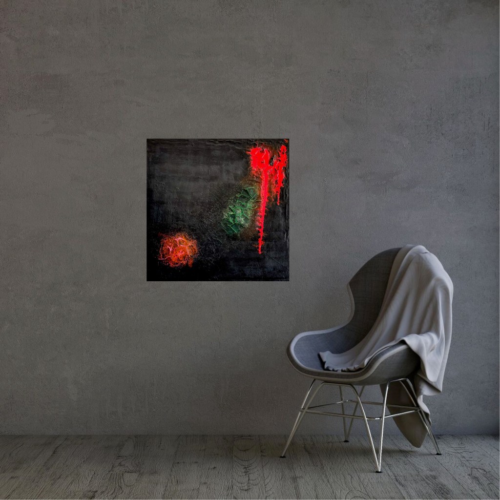 La obra de arte «When old wounds break open again» muestra una intensa y conmovedora representación del dolor y la fugacidad. Vibrantes colores rojos y verdes se extienden sobre un fondo oscuro y profundo, que recuerda a cicatrices sangrantes y estructuras rotas. Las texturas y capas de color parecen heridas abiertas y sin cicatrizar que reaparecen de repente. Las brillantes líneas rojas fluyen hacia abajo y simbolizan la renovada erupción de viejos sentimientos, mientras que el quebradizo verde evoca el proceso de curación y descomposición al mismo tiempo. La obra habla del poder de los recuerdos reprimidos y del momento en que lo oculto vuelve a salir a la luz.