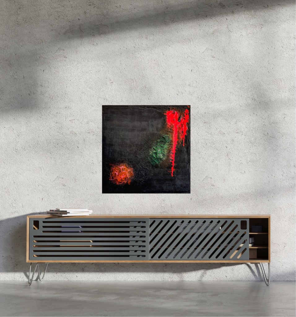 Das Kunstwerk „Alte Wunden“ zeigt eine intensive und bewegende Darstellung von Schmerz und Vergänglichkeit. Auf einem tiefdunklen Hintergrund breiten sich kräftige Rot- und Grüntöne aus, die an blutende Narben und zerbrochene Strukturen erinnern. Die Texturen und Farbschichten wirken wie geöffnete, unverheilte Wunden, die plötzlich wieder zum Vorschein kommen. Die leuchtend roten Linien strömen nach unten und symbolisieren den erneuten Ausbruch alter Gefühle, während das brüchige Grün an den Prozess der Heilung und des Verfalls zugleich denken lässt. Das Werk spricht von der Kraft unterdrückter Erinnerungen und dem Moment, in dem das Verborgene wieder ans Licht tritt.