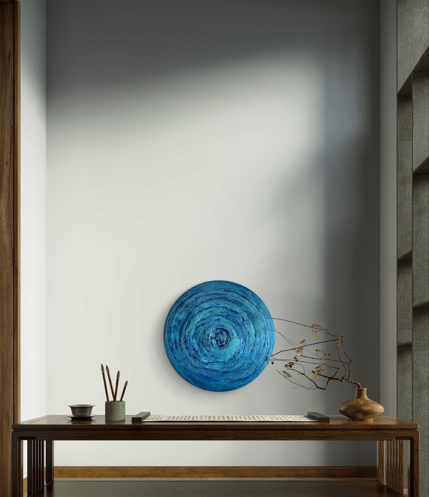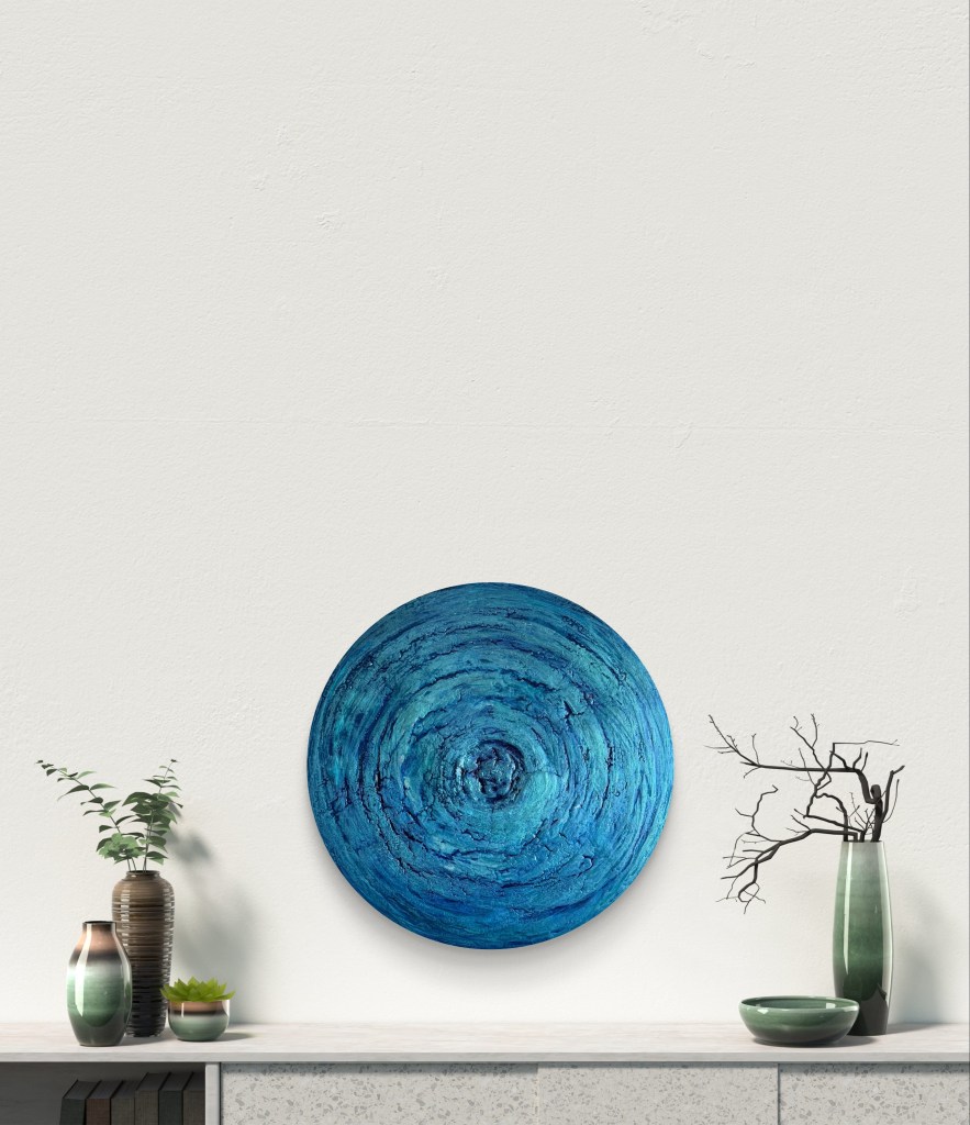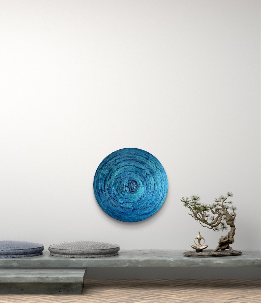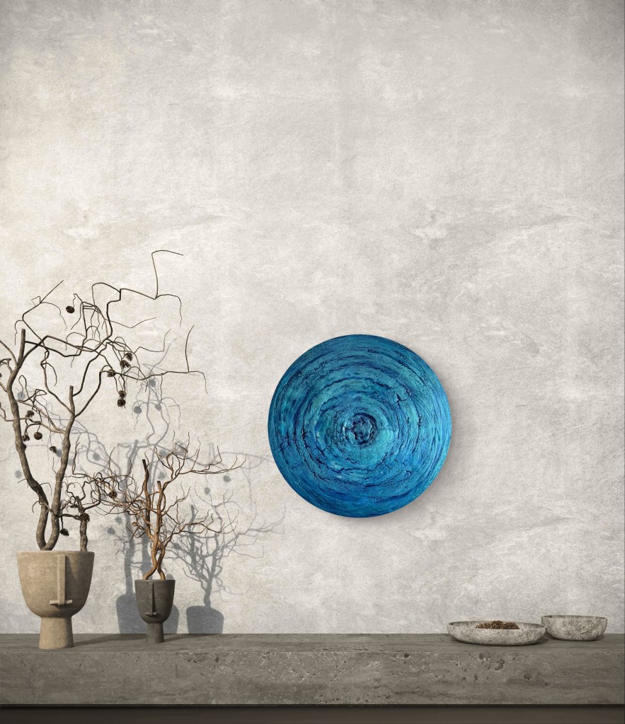 This artwork from the ‘Emotions’ series is entitled ‘Zen Meditation’. It is a circular relief with an intense, blue-turquoise colour palette that conveys a deep meditative effect. The concentric, irregularly structured circles, which extend from the centre outwards, are reminiscent of the undulations of a calm body of water or the annual rings of a tree. The surface is textured and shows fine cracks and layers reminiscent of natural erosion and growth, which reinforces the organic and harmonious feel of the work.