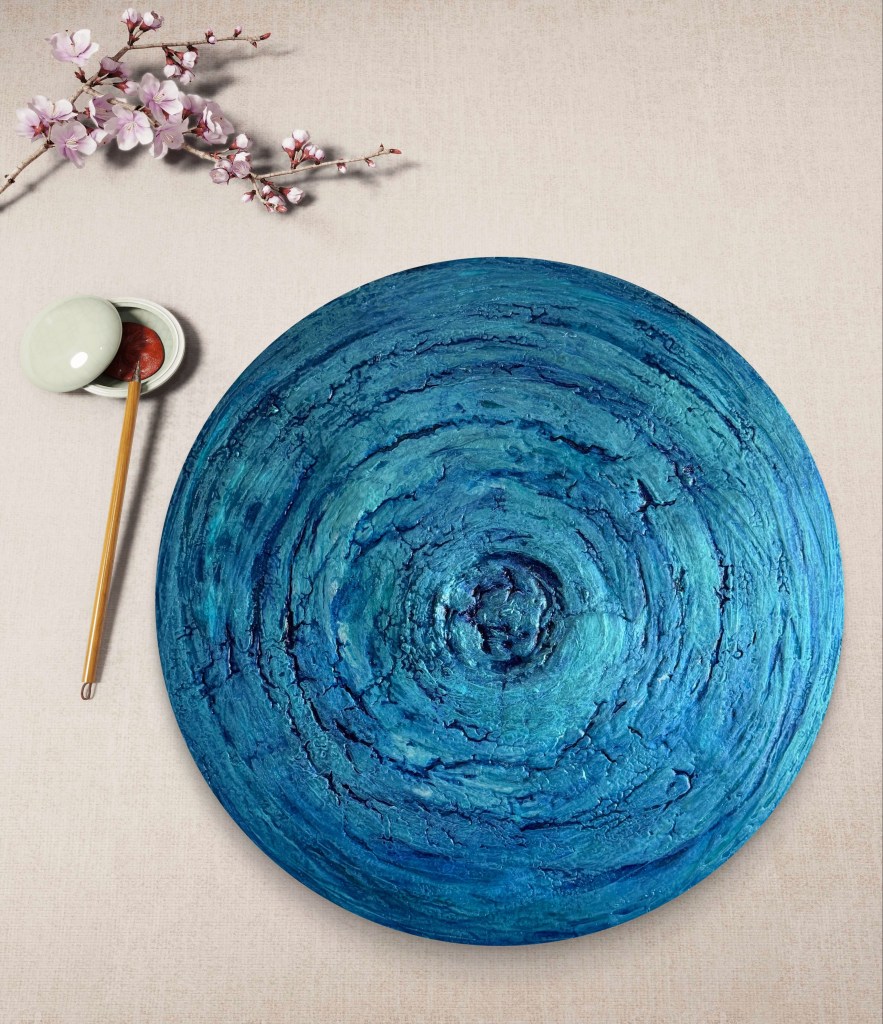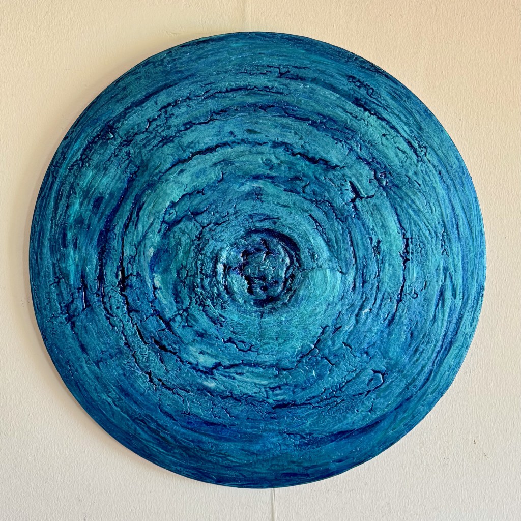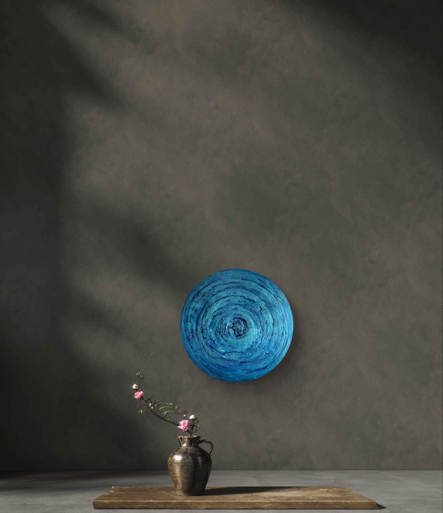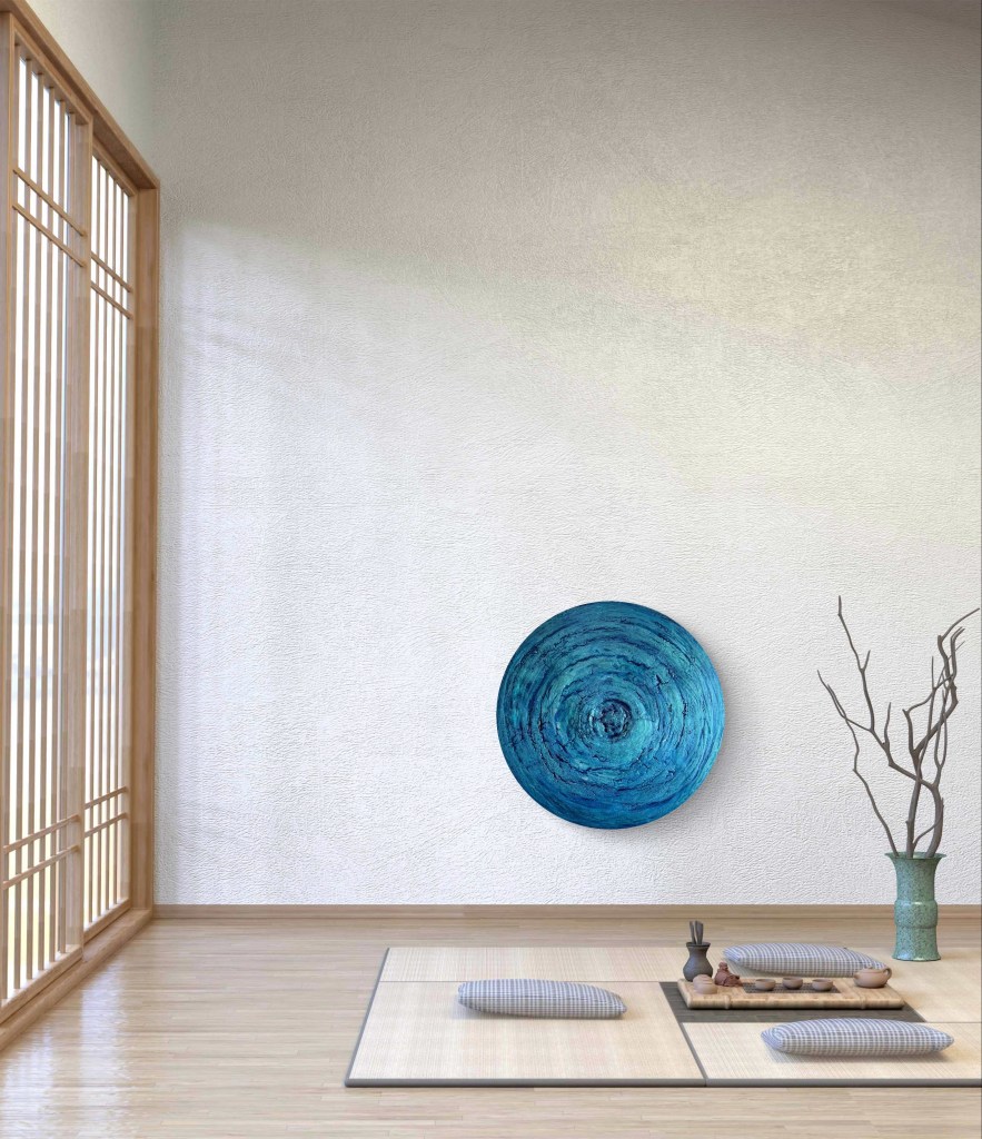 This artwork from the ‘Emotions’ series is entitled ‘Zen Meditation’. It is a circular relief with an intense, blue-turquoise colour palette that conveys a deep meditative effect. The concentric, irregularly structured circles, which extend from the centre outwards, are reminiscent of the undulations of a calm body of water or the annual rings of a tree. The surface is textured and shows fine cracks and layers reminiscent of natural erosion and growth, which reinforces the organic and harmonious feel of the work.