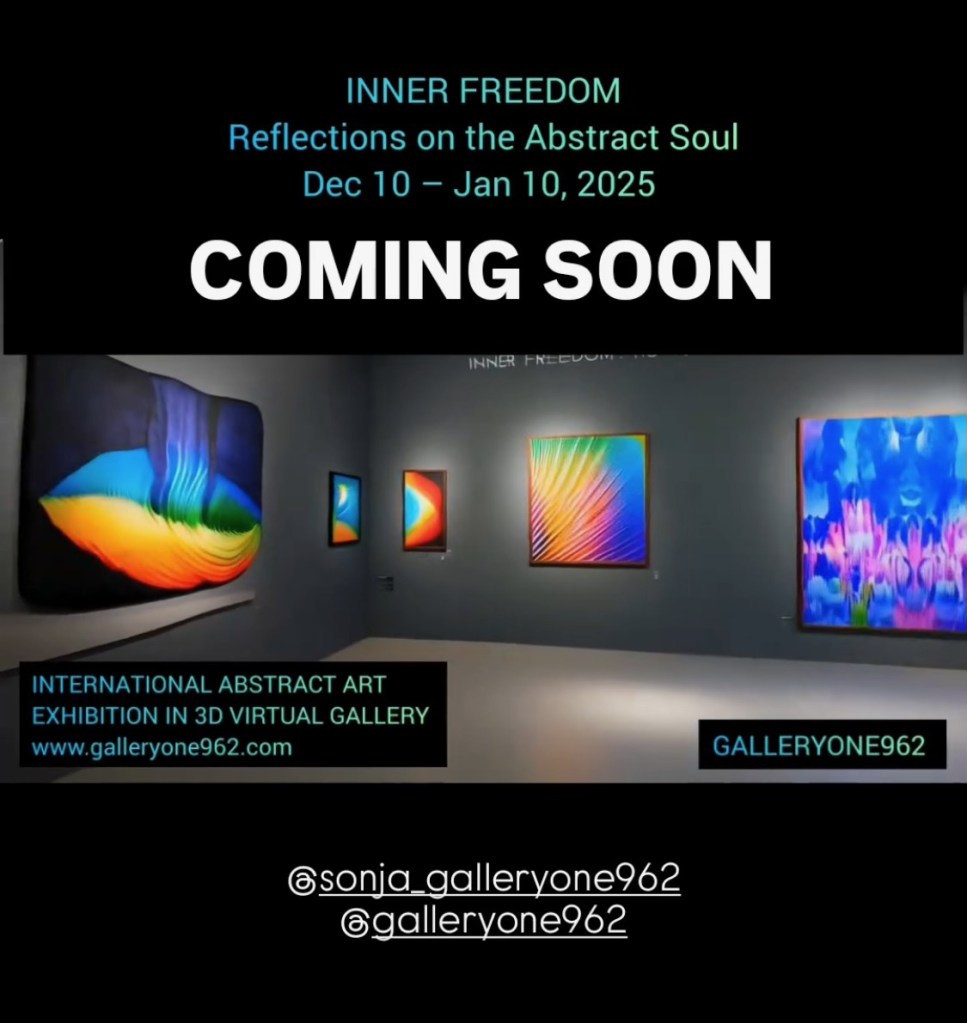 Seit Oktober nehme ich regelmäßig an einer digitalen Gruppenausstellung als „permanent Artist“ zu monatlich wechselnden Themen teil. Ab 10. Dezember ist die Ausstellung „Inner Freedom – Reflections on the abstract soul“ (Innere Freiheit – Reflexionen über die abstrakte Seele) zu sehen. Den genauen Link für die nächste Ausstellung werde ich noch mitteilen, bis dahin lohnt es sich, hier ein wenig zu stöbern! www.Galleryone962.com