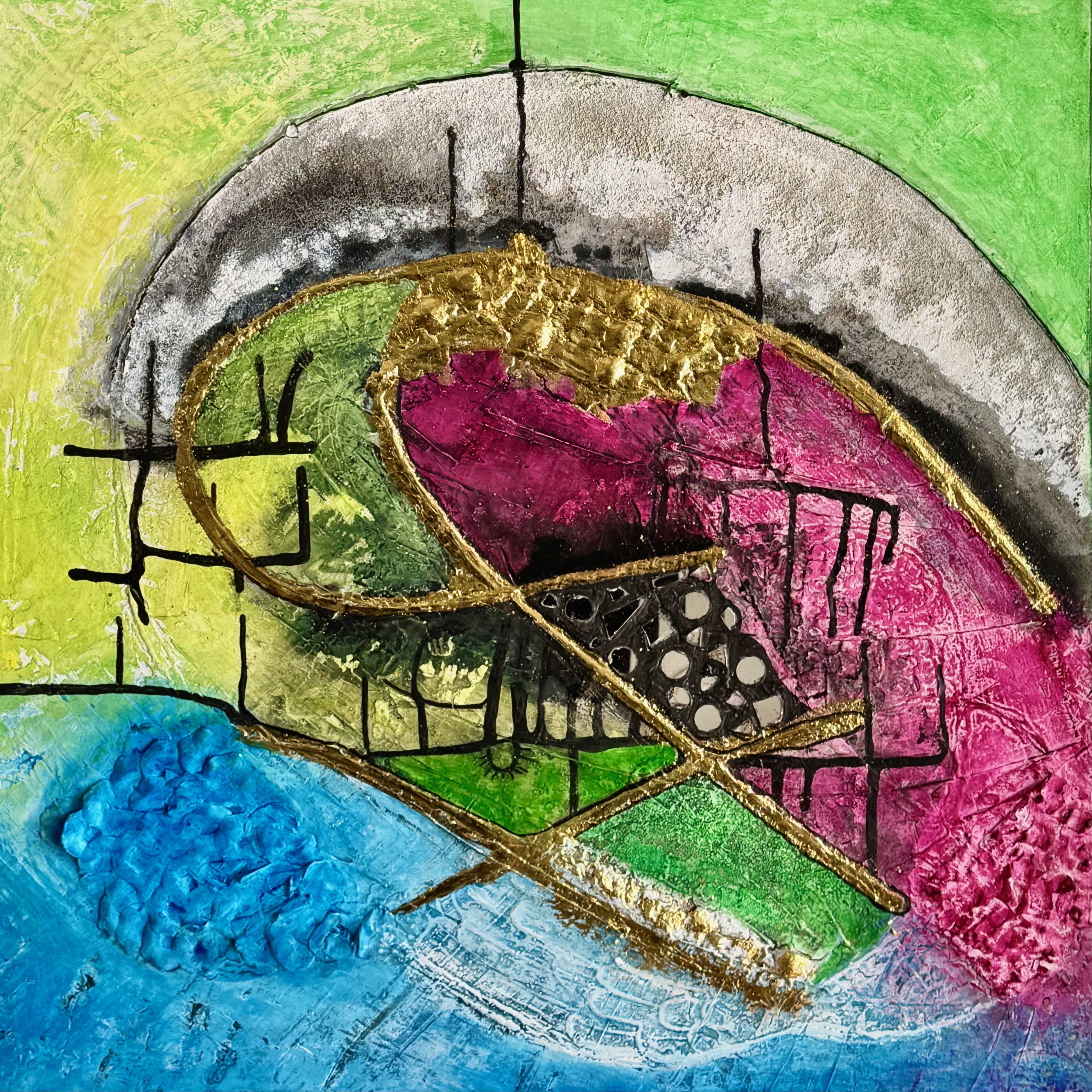 Acryl in Mixedmedia auf Leinwand, 100x100cm Dieses Werk ist Teil der Serie „Entwicklung und Transformation“. „Schnittstellen“ zeigt ausdrucksstarke, abstrakte Kompositionen und Verbindungen. Es vereint eine Vielfalt von Formen, intensiven Farben und unterschiedlichen dreidimensionalen Texturen. Das Bild steht für pulsierende, energetische Phasen von Veränderung und Transformation und ausgleichenden, ruhigen Momenten und Phasen. Die Flächen aus Blattgold … 345_Schnittstellen weiterlesen