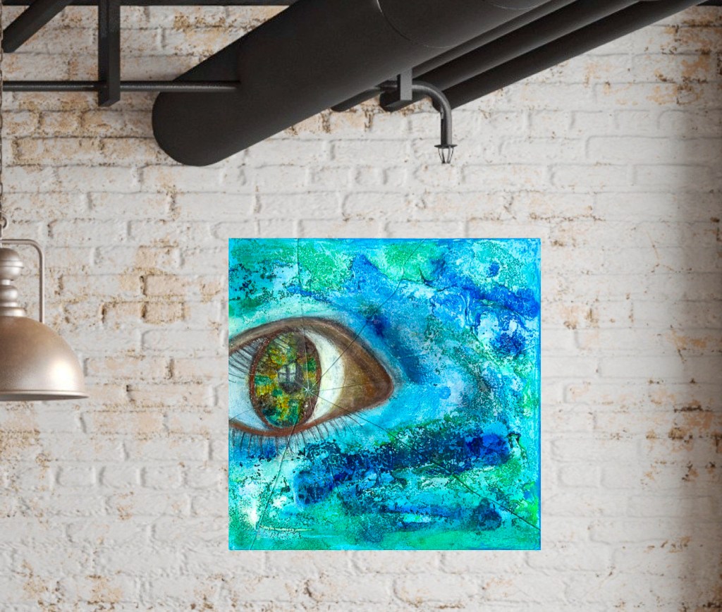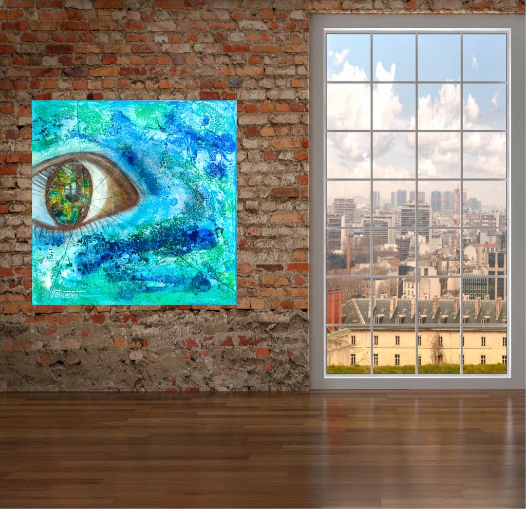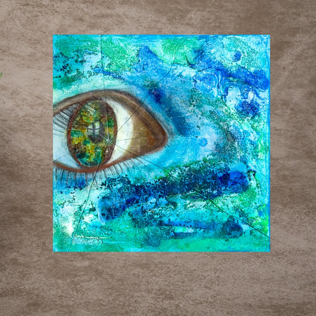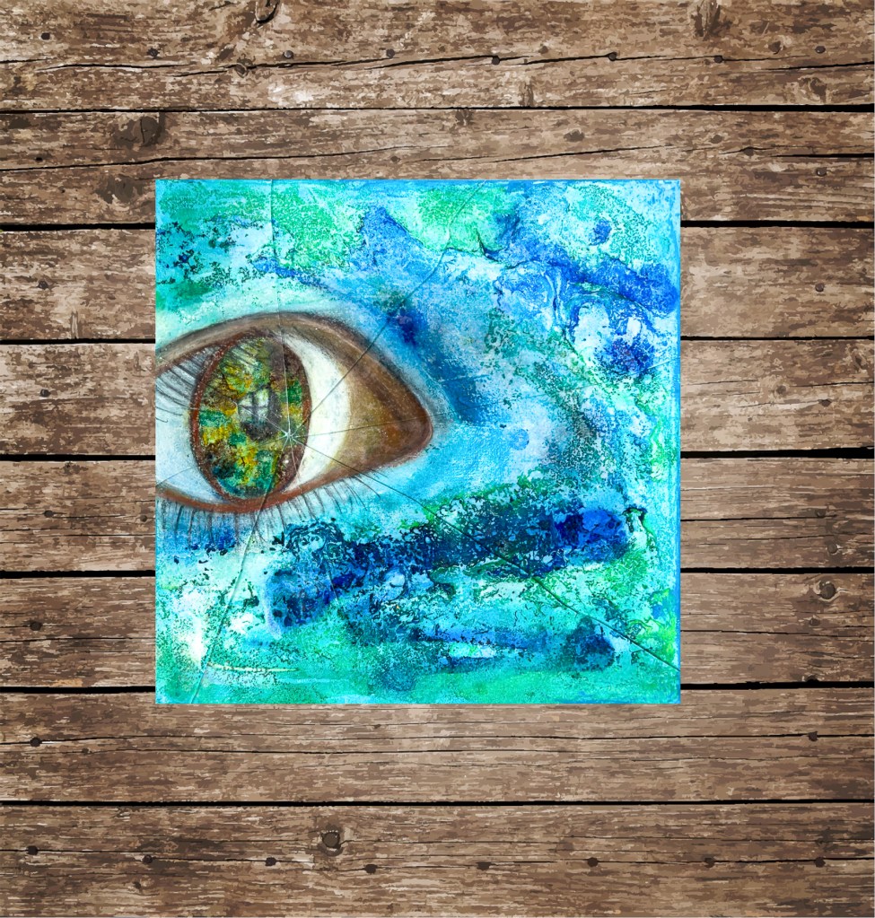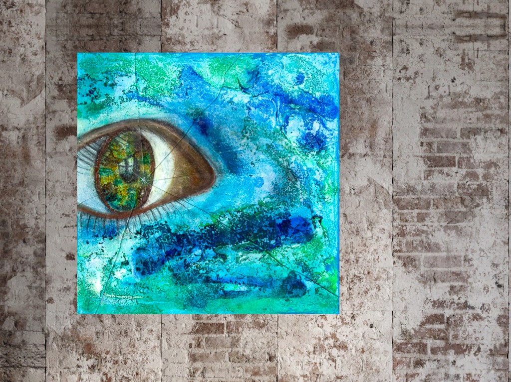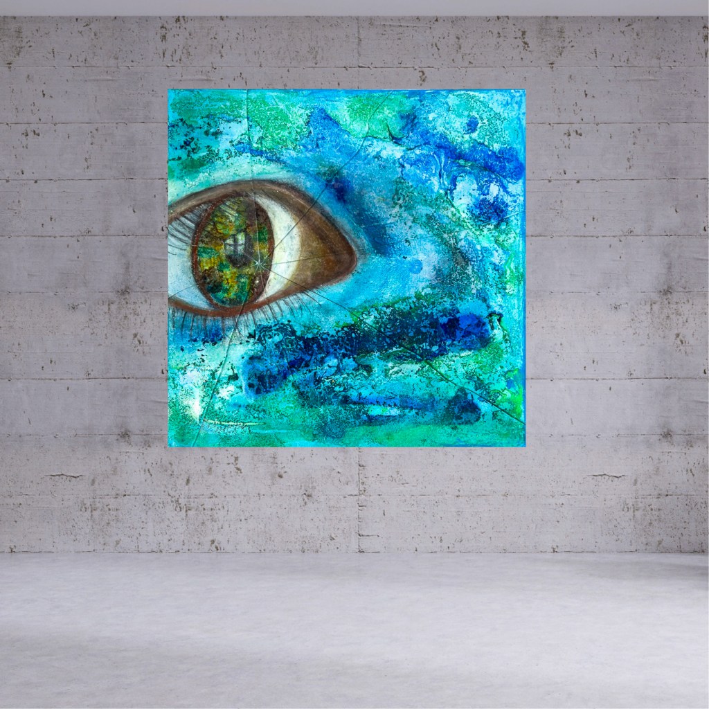 El elemento central de la obra, el ojo, se presenta aquí como una „ventana al alma“. Atrae al espectador hacia una profundidad llena de emociones y recuerdos. La coloración iridiscente y la combinación de estructuras naturales y abstractas dotan al ojo de una gran complejidad. Este efecto refuerza la impresión de que en él está inscrita una historia de dolor y sanación. Los tonos azules y verdes que lo rodean pueden interpretarse como una alusión a un océano interior de sentimientos: tormentoso, pero también purificador.