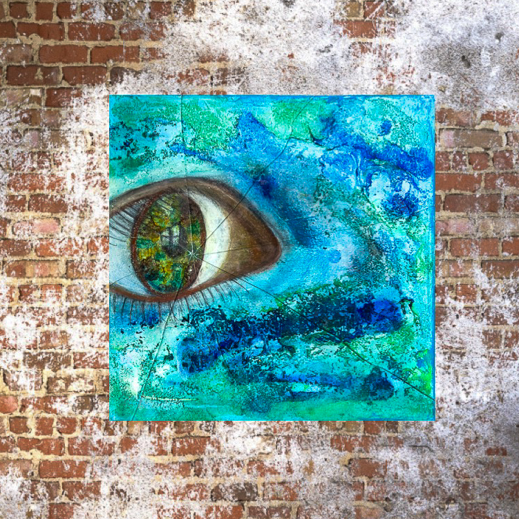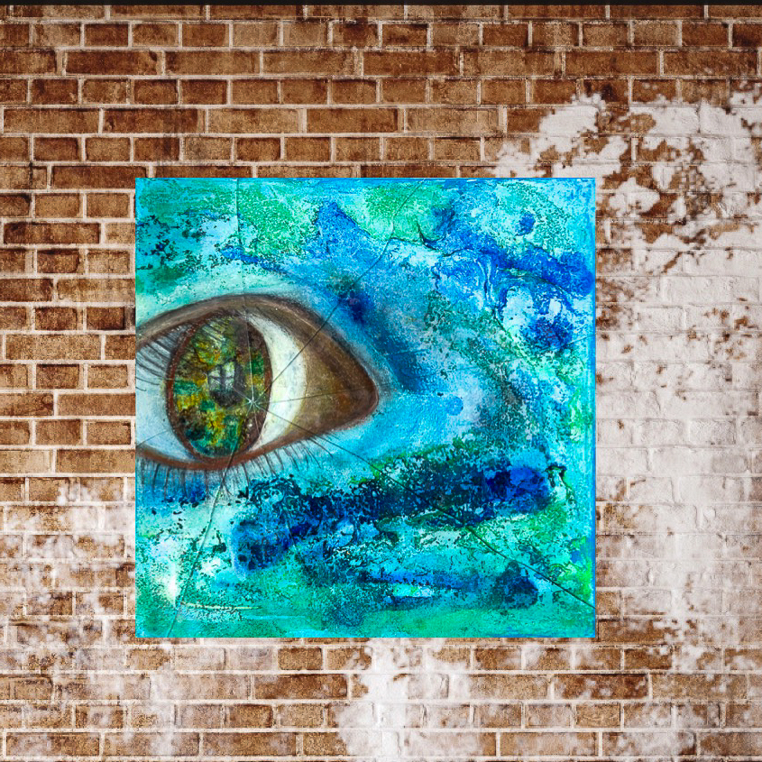 The central element of the artwork, the eye, is presented here as a “window to the soul.” It draws the viewer into a depth filled with emotions and memories. The iridescent color scheme and the combination of natural and abstract structures give the eye a multifaceted quality. This effect reinforces the impression that a story of pain and healing is inscribed within it. The surrounding blue and green tones can be interpreted as a reference to an inner ocean of emotions—turbulent, yet also cleansing.