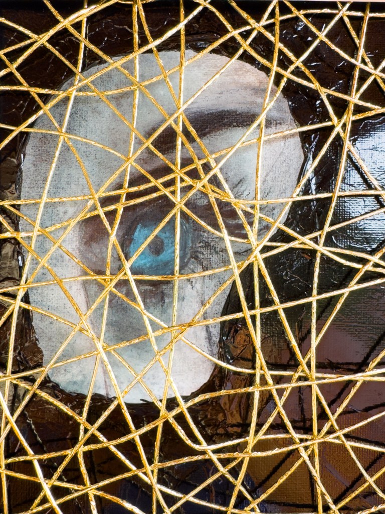 Die goldenen Fäden, die sich wie ein Netz über den Teil eines Gesichts auf dunklem Hintergrund ziehen, wirken wie die Gitter eines Käfigs. Das weiblich anmutende Gesicht zeigt ein großes blaues Auge dessen Blick in die Weite aus dem rechten Bildrand heraus geht.
