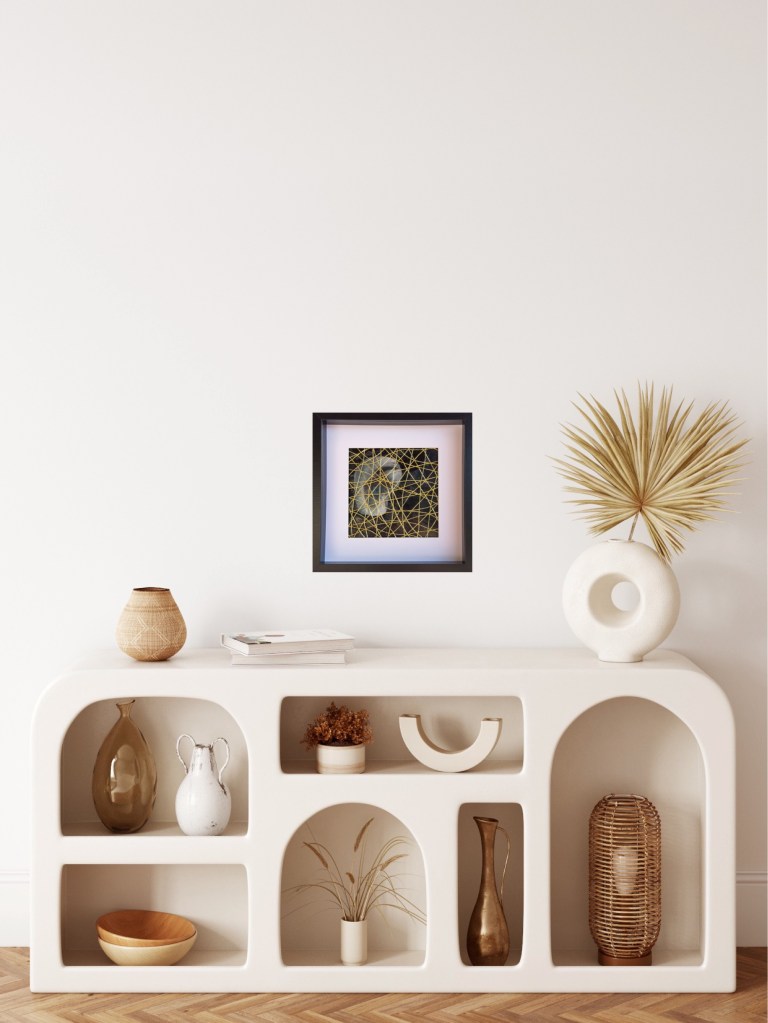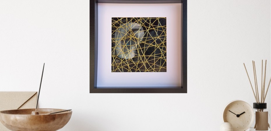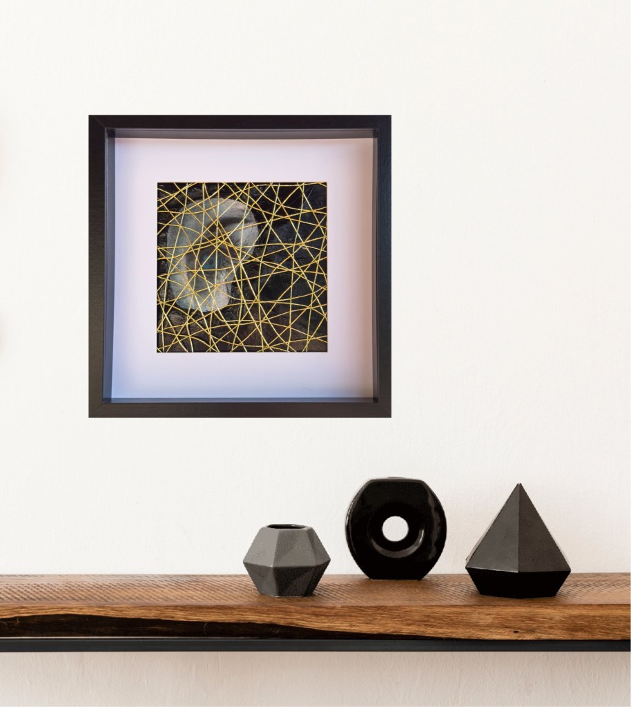 Acrílico y pastel suave detrás de hilos dorados en un marco de madera negro con paspartú sobre 32x32x4cm.