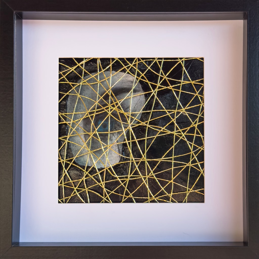 Acrylic and soft pastel behind golden threads in a black wooden frame with passepartout. 31x31x4cm.