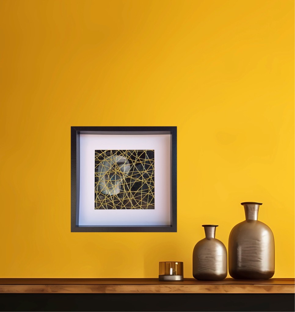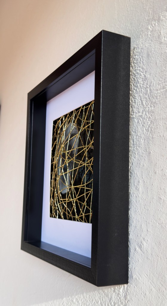 🇩🇪 Acryl und Softpastell hinter goldenen Fäden im schwarzen Holzrahmen mit Passepartout auf 31x31x4cm.