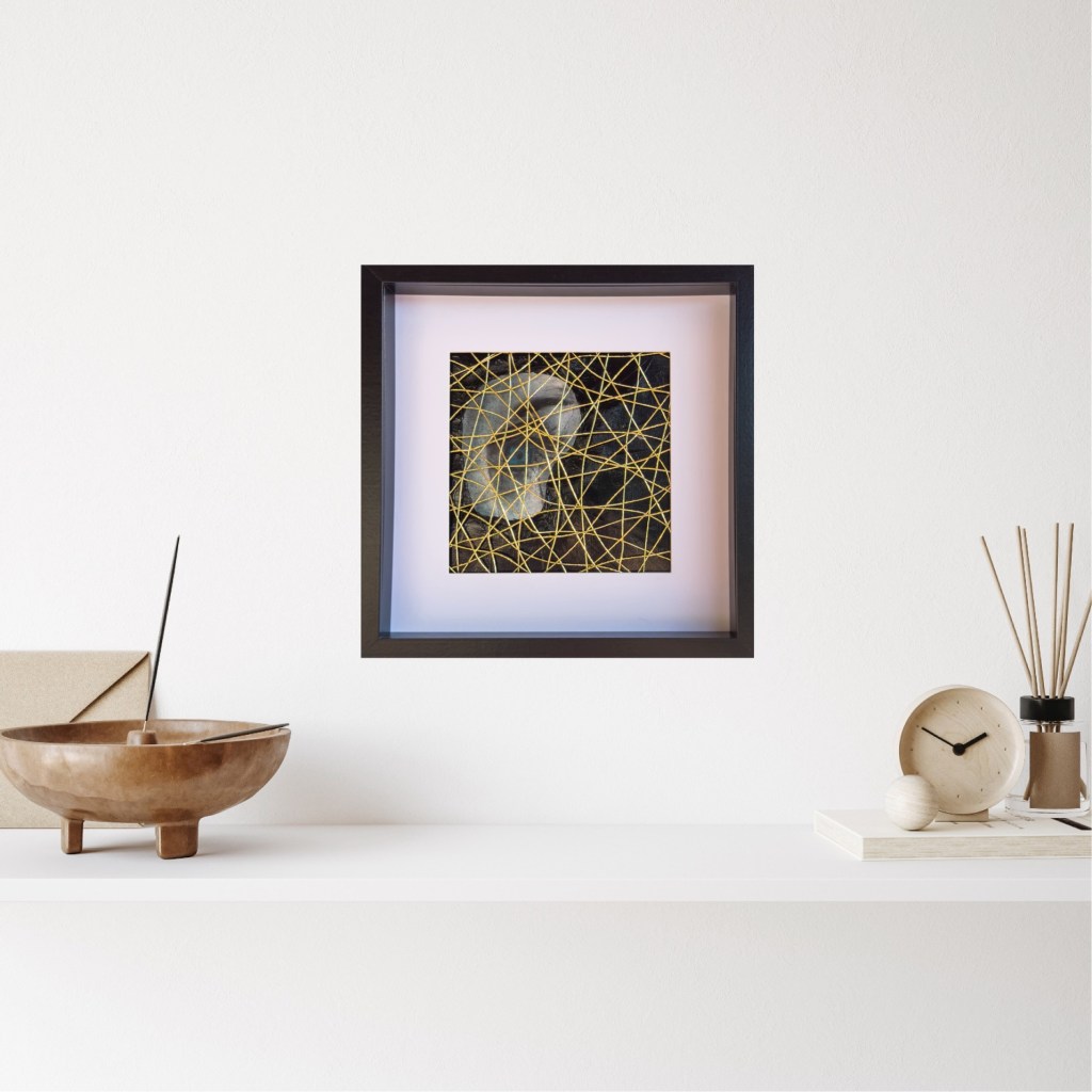 Acrílico y pastel seco detrás de hilos dorados en un marco de madera negra con passepartout. 31x31x4cm.