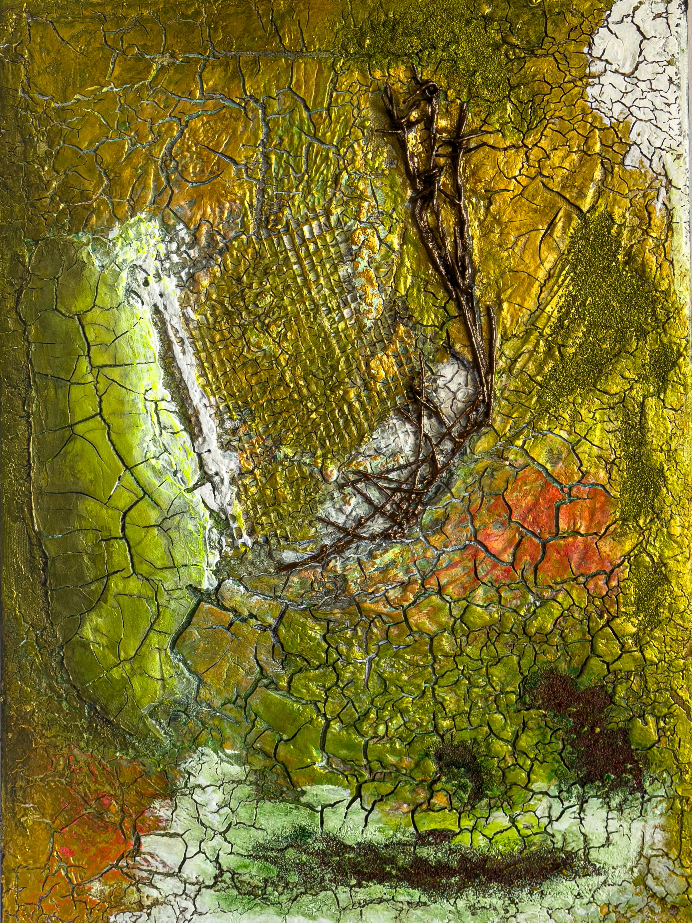 Mixed Media auf Leinwand, 50x60cm 🇩🇪  Dieses Werk lädt dazu ein, in die vielschichtige Welt innerer Erfahrungen einzutauchen. Risse und Strukturen durchziehen die Oberfläche wie Spuren von Erinnerungen – Zeichen eines Inneren, das durch Zeit und Erlebtes geformt wurde. Die Farben bewegen sich zwischen erdigen Grün- und Goldtönen, durchbrochen von leuchtendem Orange und Weiß … 363_Inner landscapes weiterlesen