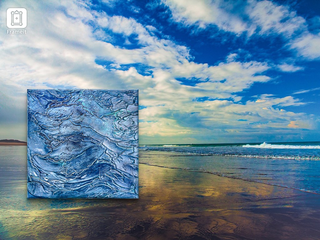 La superficie texturizada y en capas recuerda al agua agitada, recorrida por corrientes. Las líneas finas y formas suaves generan una dinámica rítmica que transmite calma y energía al mismo tiempo. Los reflejos brillantes intensifican esta sensación y otorgan a la pintura una presencia casi viva.