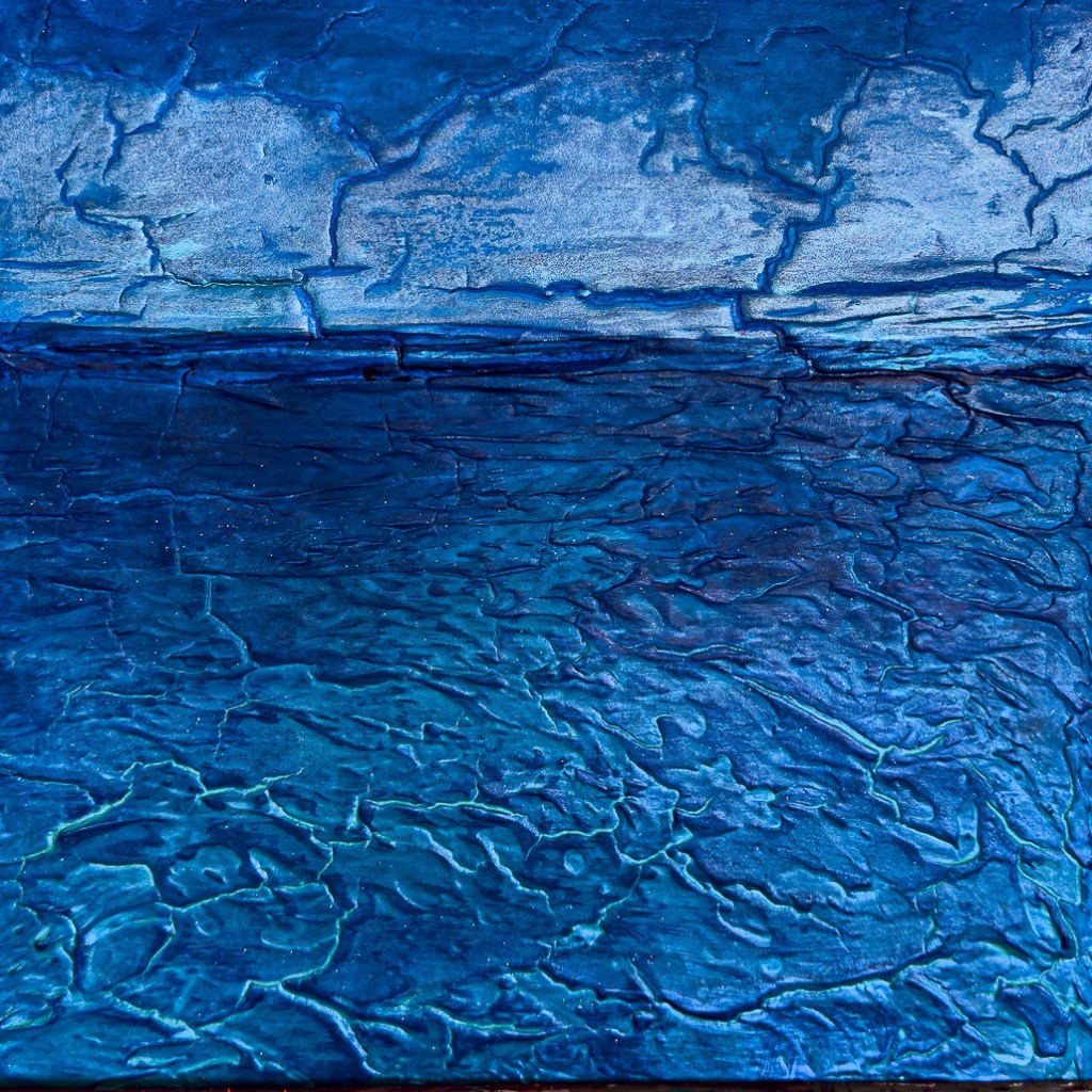 „370_Horizont“ zeigt eine stille, fast meditative Meereslandschaft, bei der Horizontlinie und Wasserfläche ineinander übergehen. In tiefen Blau- und Türkistönen entfaltet sich eine ruhige Weite, durchzogen von feinen Strukturen, die wie Trockenrisse oder Meeresströmungen wirken. Die plastische Oberfläche verleiht dem Bild eine geologische Qualität – als würde man durch das Wasser in die Tiefe der Erde blicken.