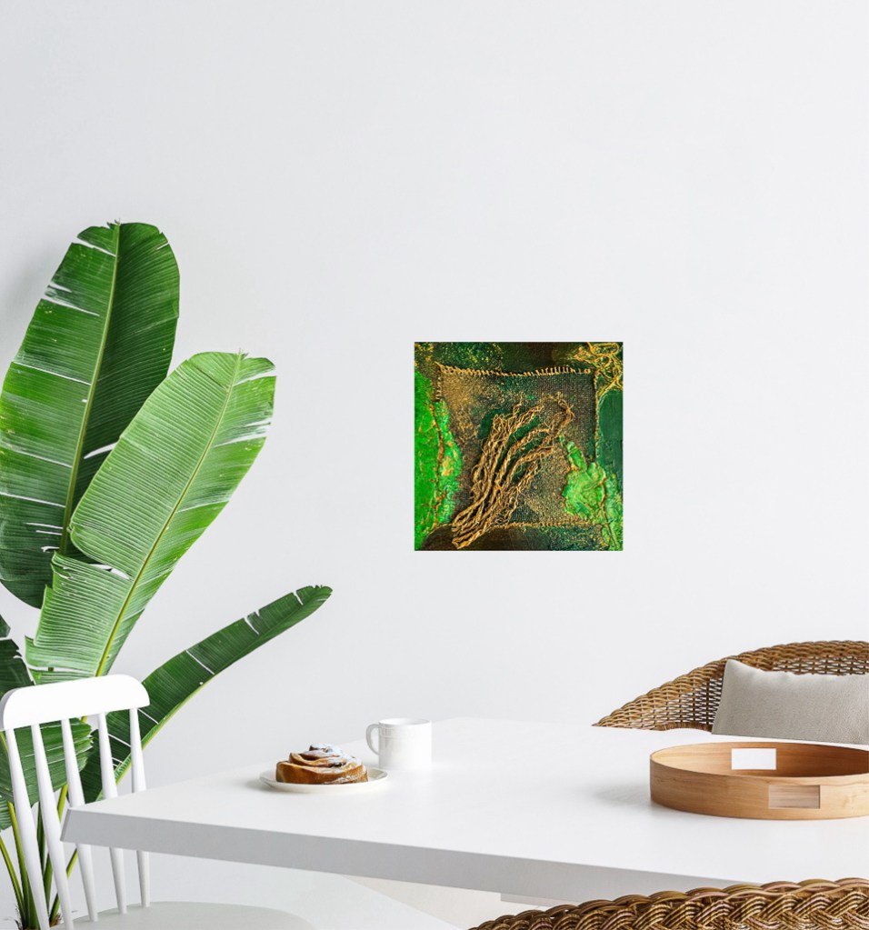 Die Kombination aus Relief und Farbe verleiht dem Kunstwerk eine fast greifbare Lebendigkeit. Goldene Akzente verstärken das Lichtspiel und bringen eine subtile Dynamik ins Bild. „Green impressions“ ist eine visuelle Hommage an die Kraft und Zerbrechlichkeit der Natur – roh, vielschichtig und voller Bewegung.