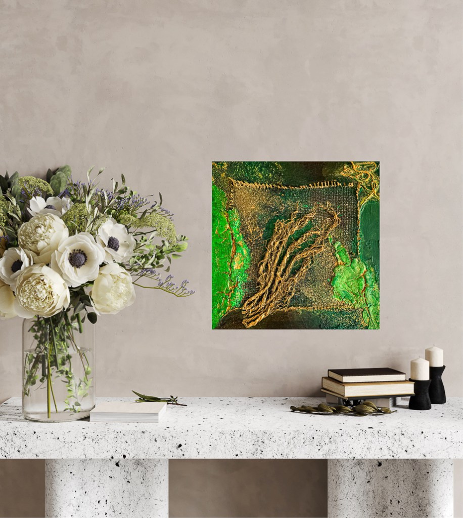 La combinación de relieve y color le otorga a la obra una presencia viva, casi táctil. Los acentos dorados intensifican la luz y aportan un movimiento sutil. “Green impressions” es un homenaje visual a la fuerza y fragilidad de la naturaleza: cruda, compleja y llena de vida.
