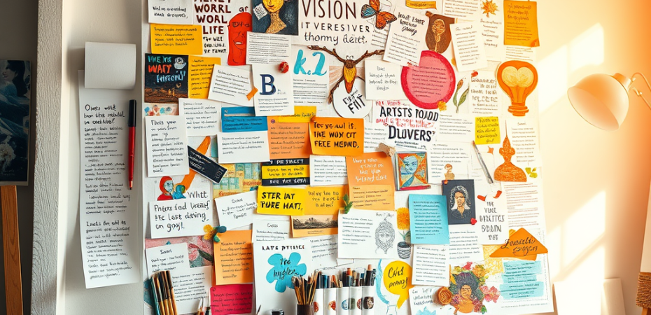 Diese Auseinandersetzung führte schließlich zu einem Plakat – heute würde man wohl „Visionboard“ sagen. Neben Skizzen und kleinen Zeichnungen habe ich Leitsätze und Gedanken notiert, die mir als Künstlerin und Mensch wichtig sind.