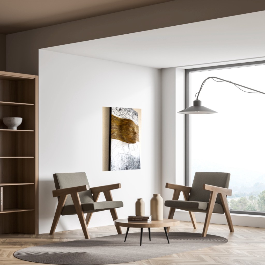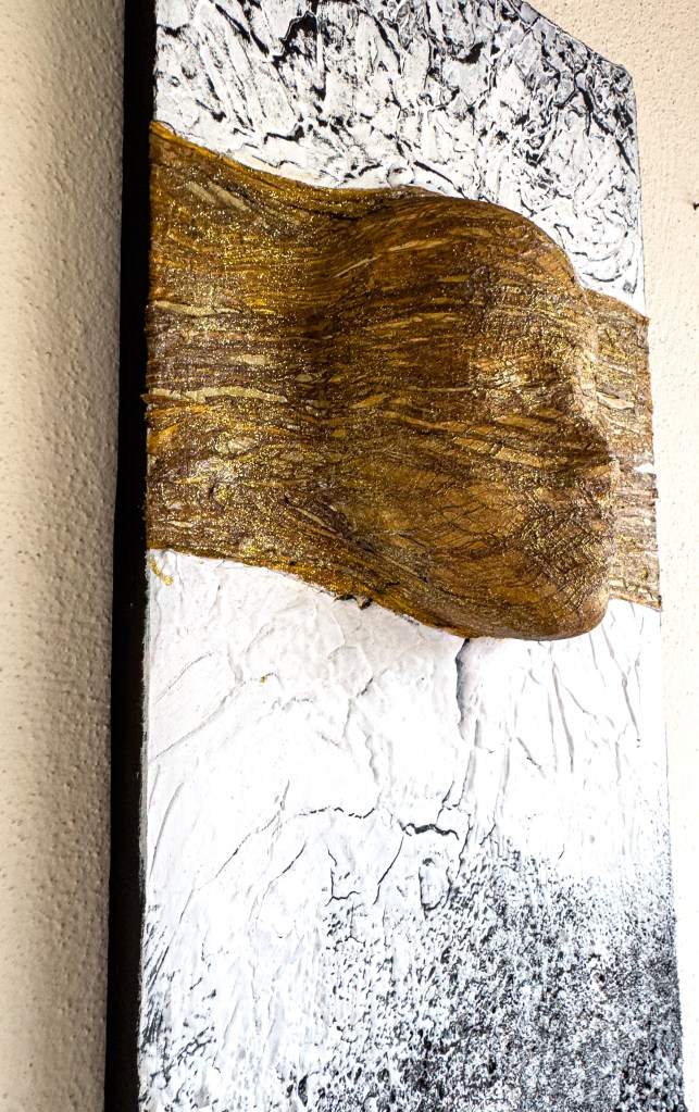 As part of the series Development and Transformation, this work symbolizes the search for identity and the forces of change: the face as a metaphor for the individual, the golden threads as representations of external influences, memories, and experiences that envelop and shape us, while at the same time opening the path toward a new existence.