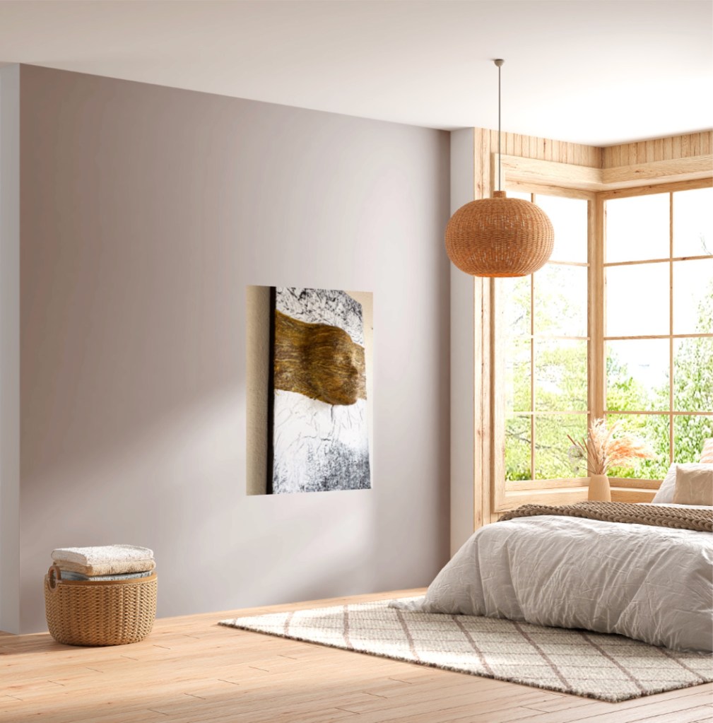 La obra Gone with the wind… muestra un rostro oculto, envuelto por finos hilos dorado-marrones. Como una red que protege o vela, el entramado cubre los rasgos, que solo se perciben de manera difusa. Este juego entre ocultar y revelar genera una tensión intensa: el rostro parece atrapado y al mismo tiempo sostenido, resguardado y a la vez distante.