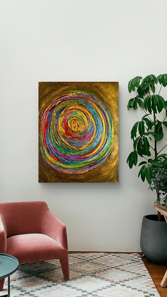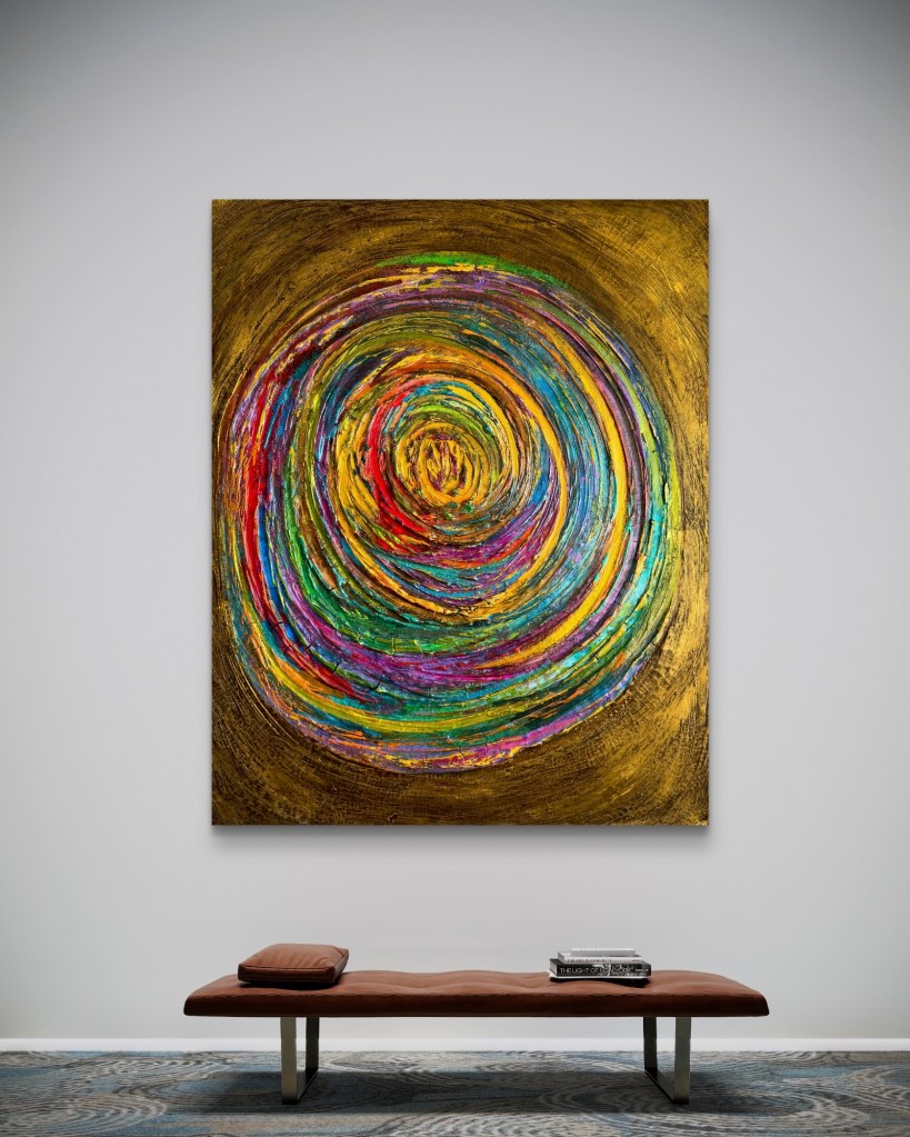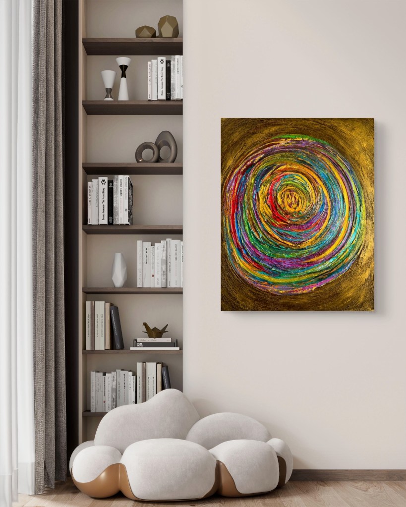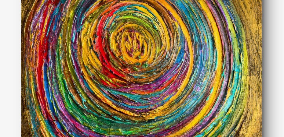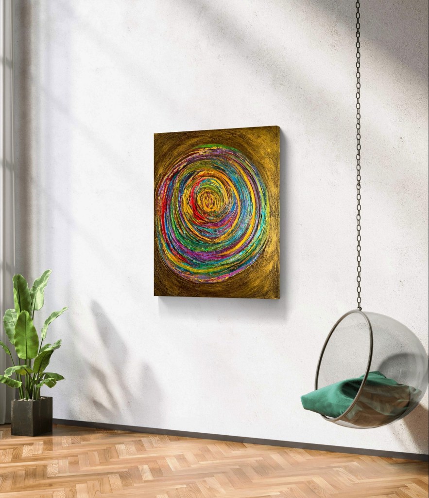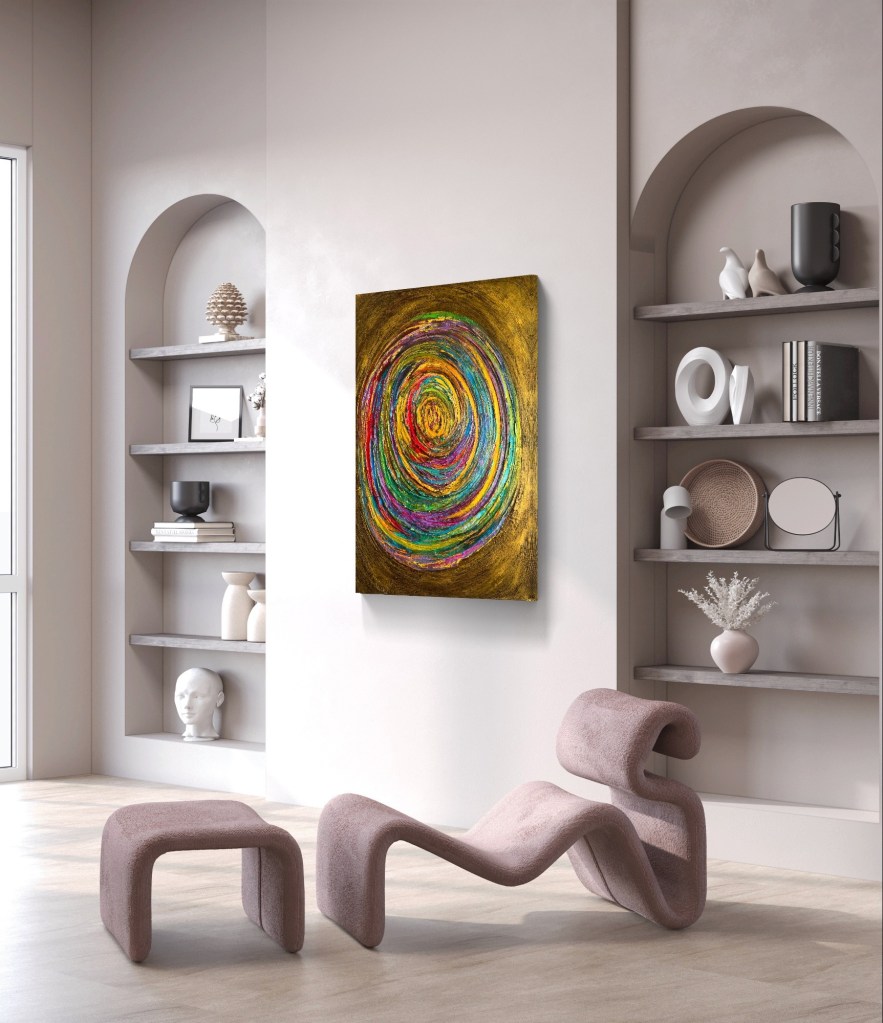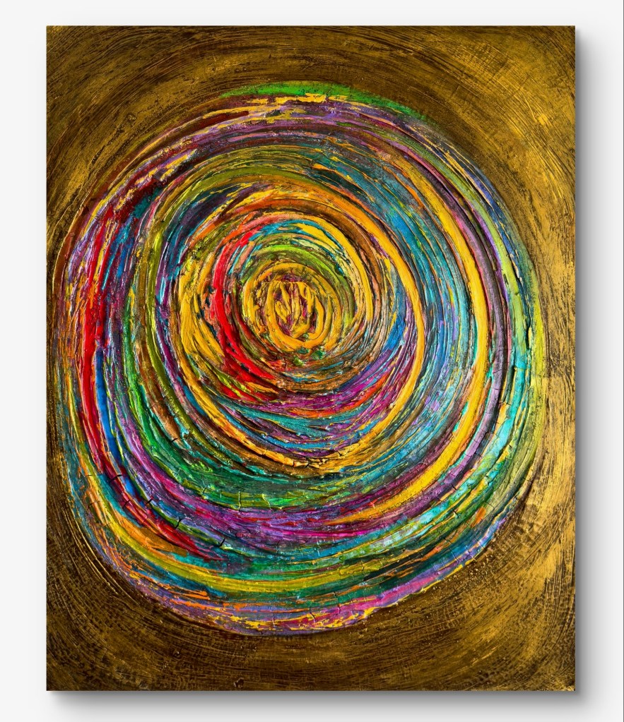In Diversity wird der Kreis zur Bühne eines vielstimmigen Dialogs. Reliefartige Farbschichten wachsen Schicht um Schicht zu einem vibrierenden Organismus, in dem jede Nuance ihr eigenes Gewicht behält und doch im Einklang mit den anderen schwingt. Warmes Gelb trifft auf kühles Blau, strahlendes Orange auf tiefes Violett – Gegensätze, die sich nicht ausschließen, sondern gegenseitig verstärken.