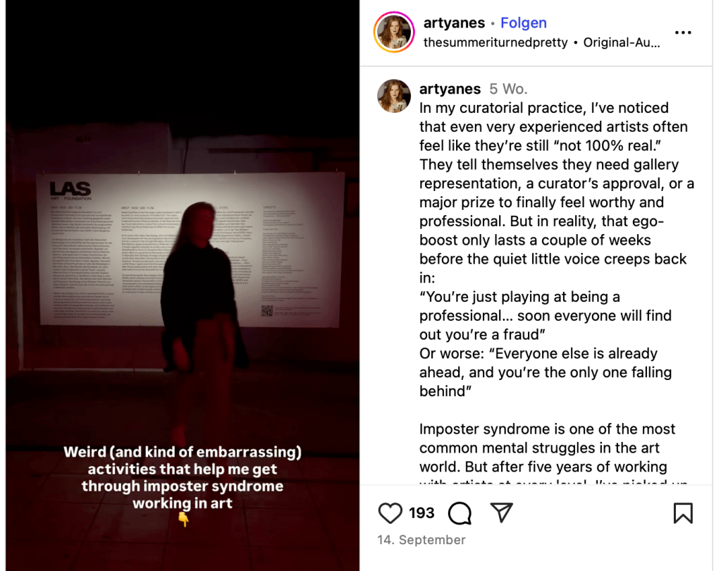Interessant, wenngleich nicht unbekannt, aber kompakt zusammen gefasst: 29 Einblicke und Hinweise für Künstler:innen, Autorin @aryanes Instgrampost vom 14. September 2025