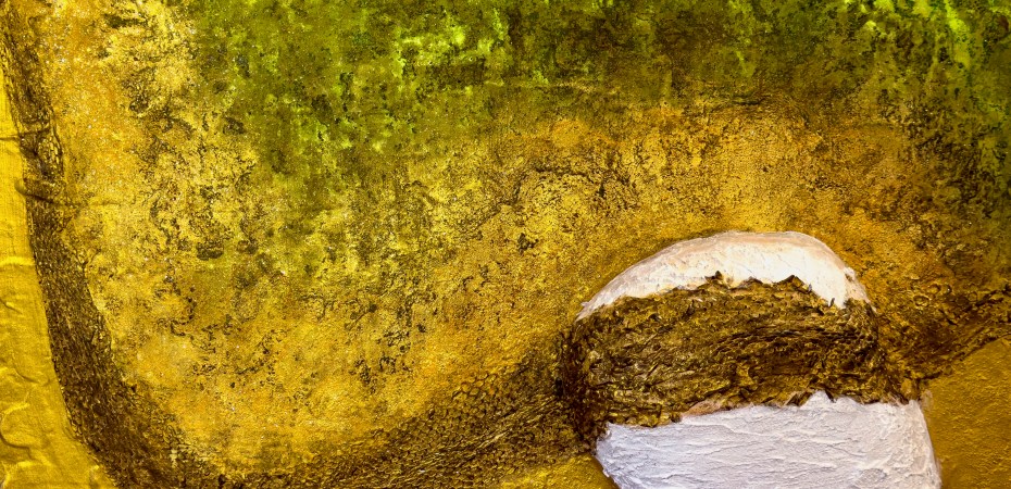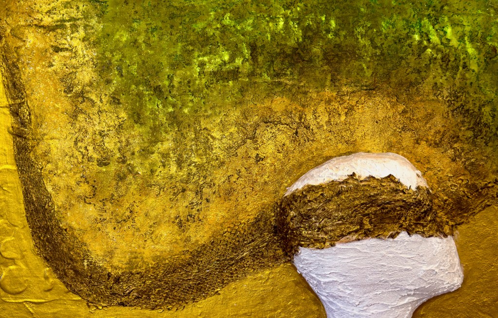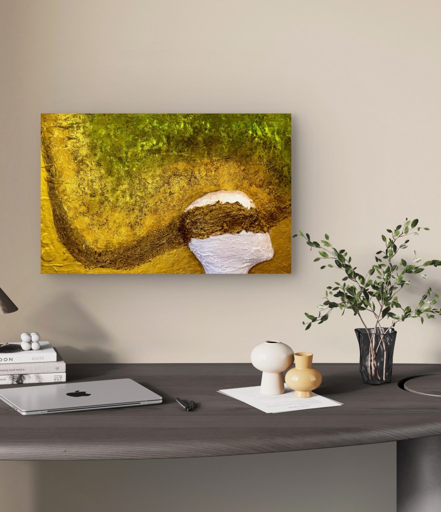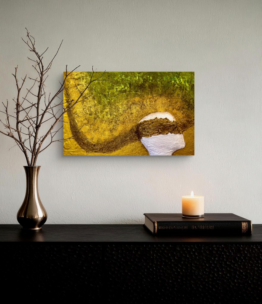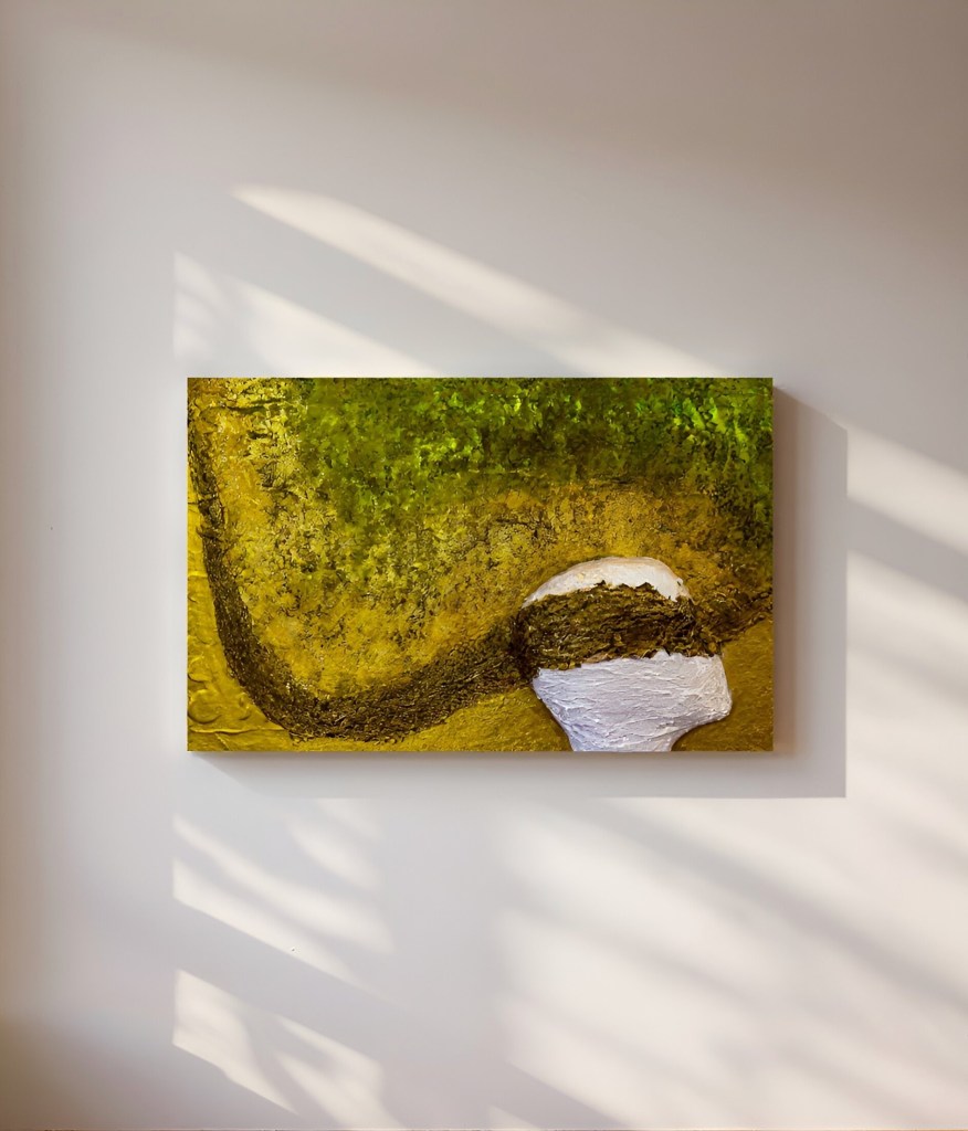 In “Moulting of the Mind,” transformation unfolds as a quiet, inward process. Layer by layer, the work reveals change not as something overt, but as something sensed. Earthy tones of yellow, green, and brown merge into an organic surface where growth, erosion, and renewal coexist.