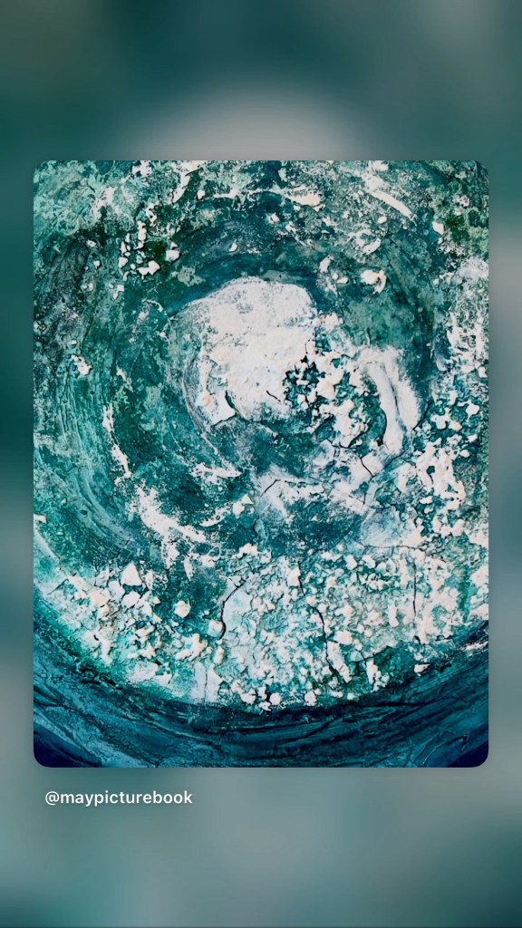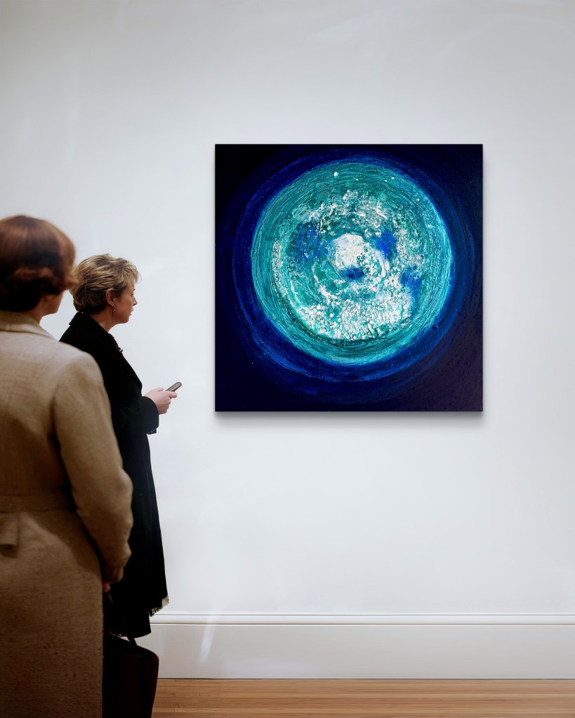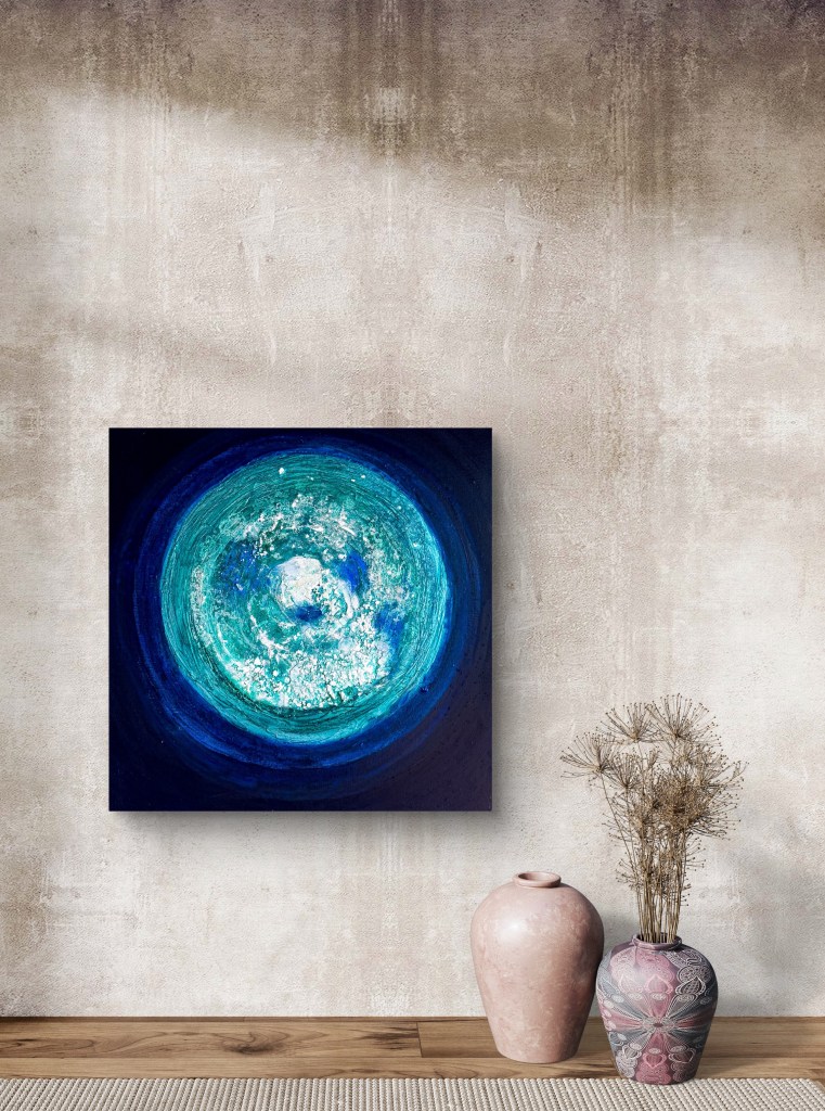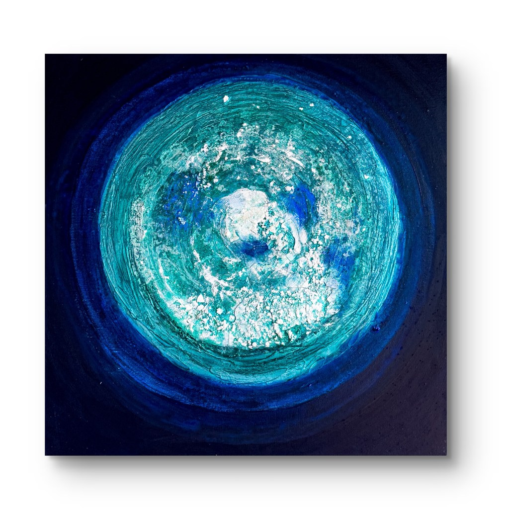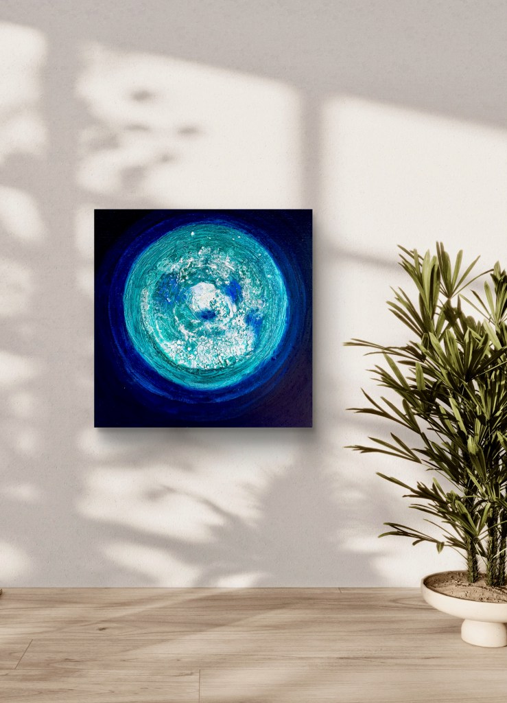 In “Melting Poles,” the theme of change is condensed into a circular, almost planetary form. A luminous center of turquoise, white, and blue appears to dissolve, surrounded by darker zones that evoke depth, cold, and distance. The composition recalls melting ice, polar caps in transition—fragile, in motion, no longer stable.