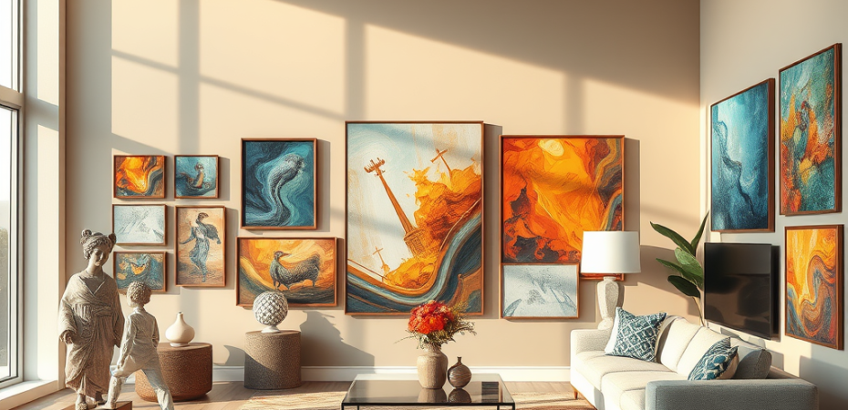 Kunst kann nahtlos in die Einrichtung integriert werden. Platziere Skulpturen auf Möbeln, kombiniere Leinwände mit Regalen oder stelle kleinere Objekte auf Sideboards. Das Zusammenspiel zwischen Kunst und Raumdesign schafft eine harmonische Atmosphäre.